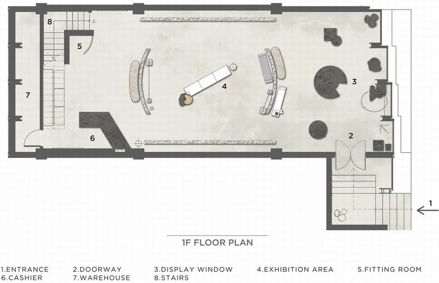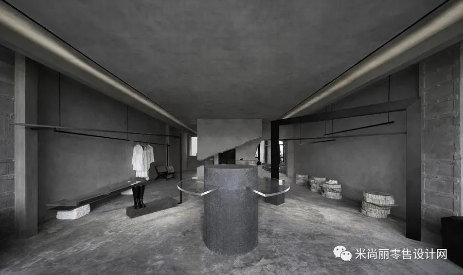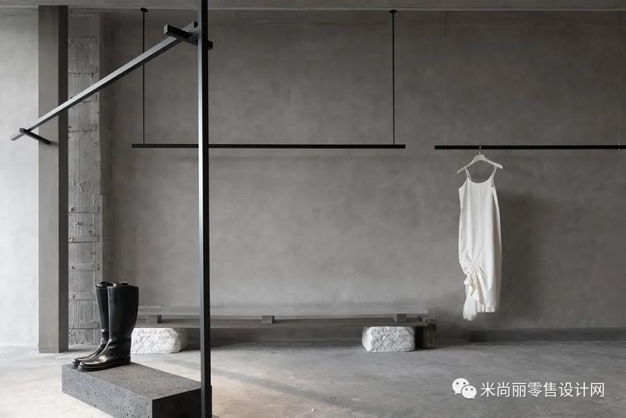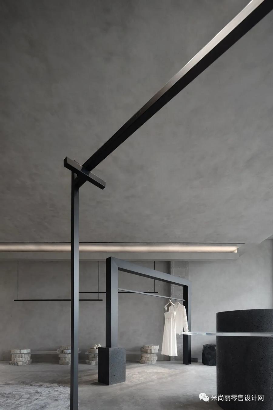 整个空间的设计是在各种实地考察和分析的基础上,最后结合创作思路进行的。设计师将设计灵感提取到商品上,并将解构运用到不同的空间领域。空间的设计色调围绕着暗、时尚、酷、质感、纯净,空间也运用了黑、灰、白、木的组合。