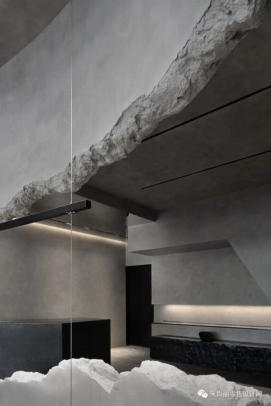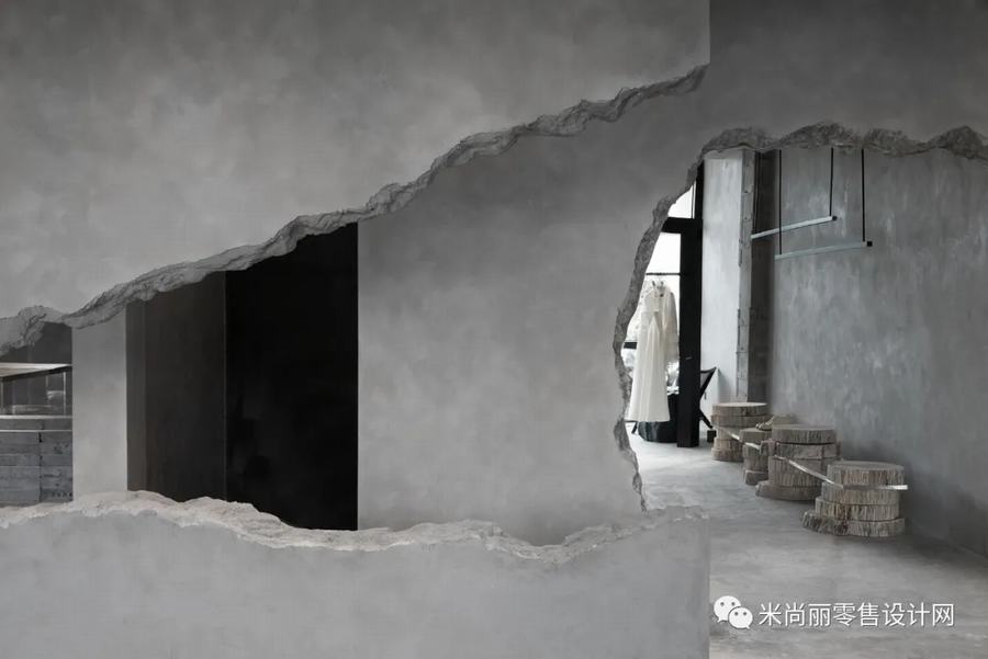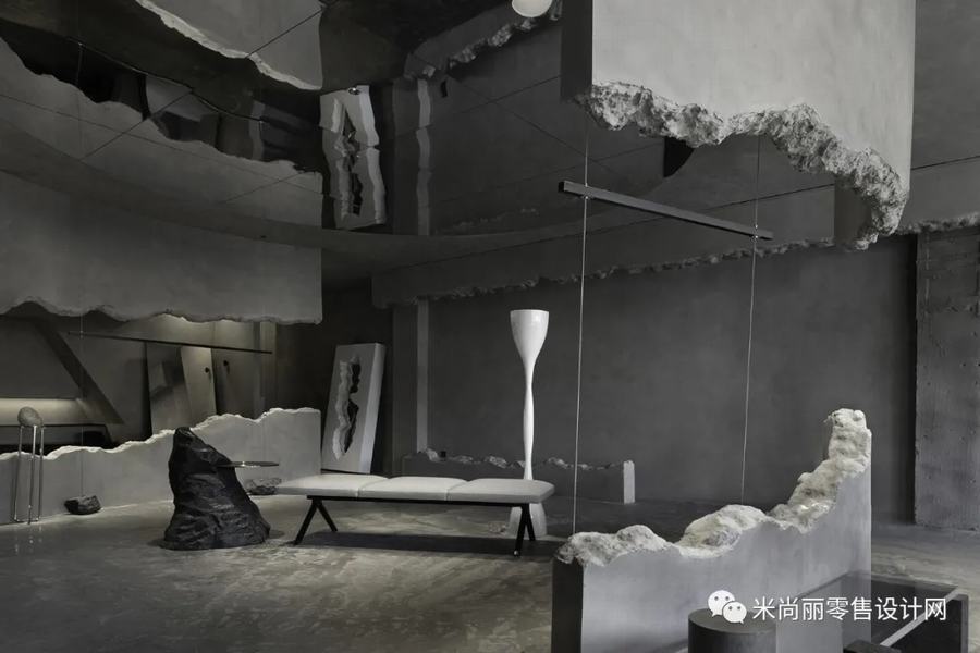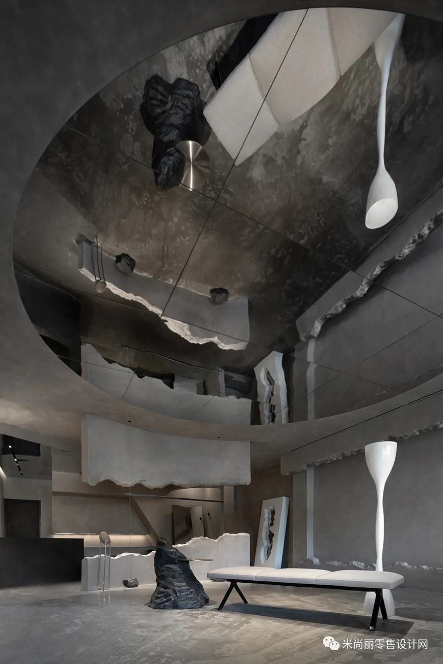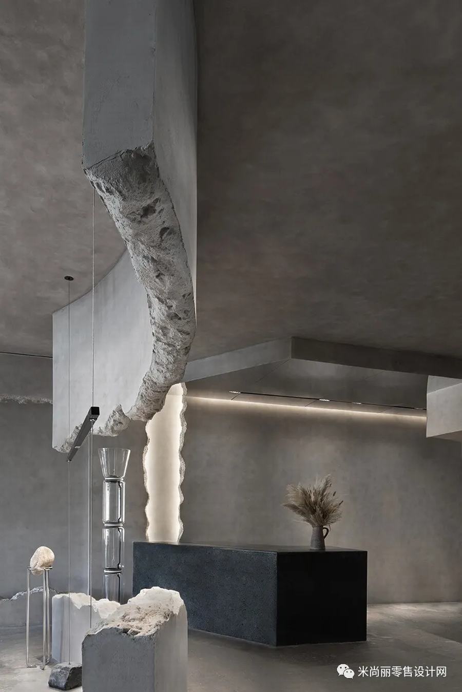 设计师的灵感来自美国艺术家 Daniel Arsham,也受到 Arsham 未来考古风影响。他们在设计上保持了原有的建筑效果,也创造了一道裂痕墙,在表达空间中的考古空间的同时,将一堵墙当作一道屏障,斑驳的墙被一种牵引力撕裂。当连接天花板和地板的墙壁破裂,碎片坍塌时,另一个不同的世界会慢慢有序地呈现出来,就像这是一个破裂的废墟世界,也是空间与空间的交点。