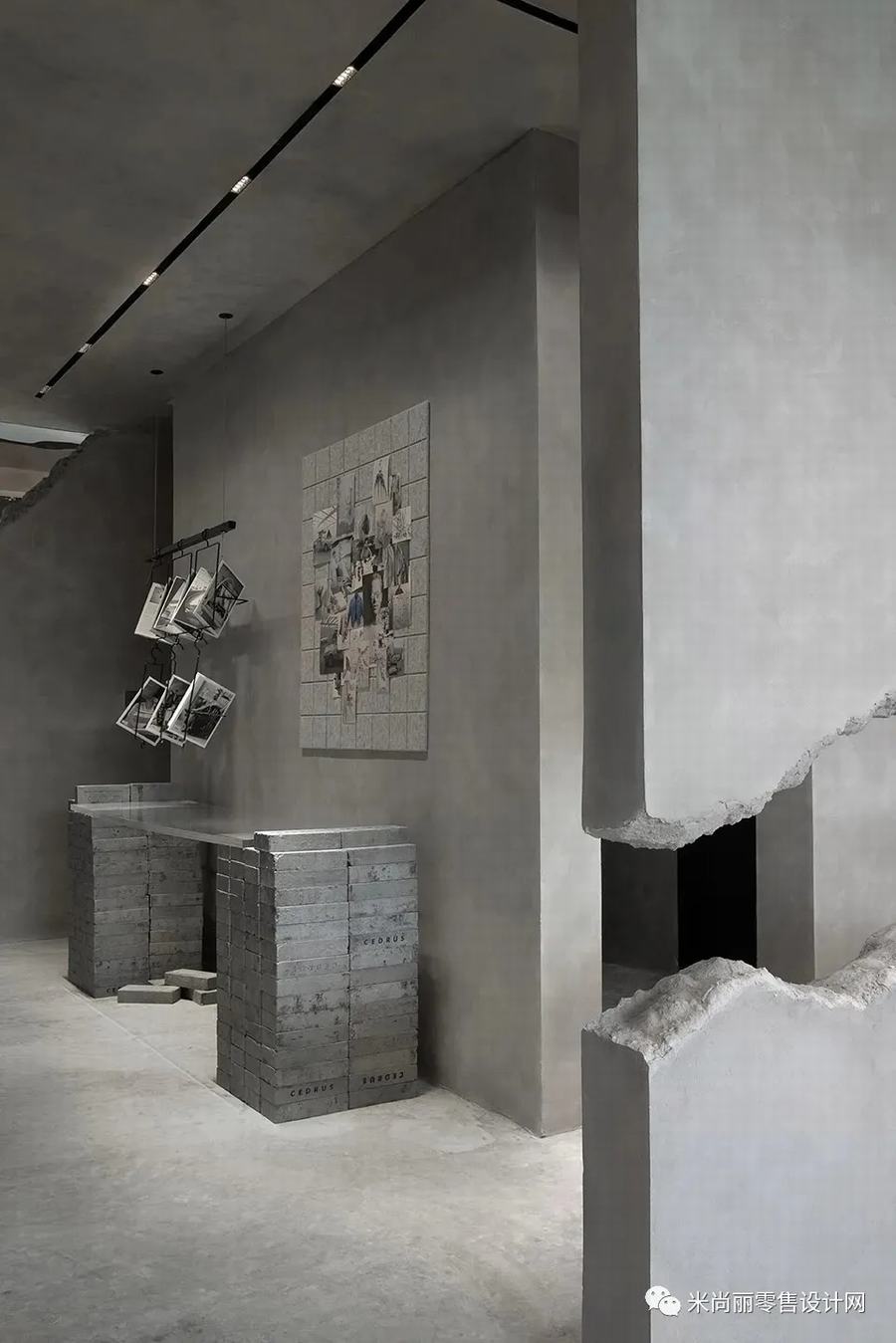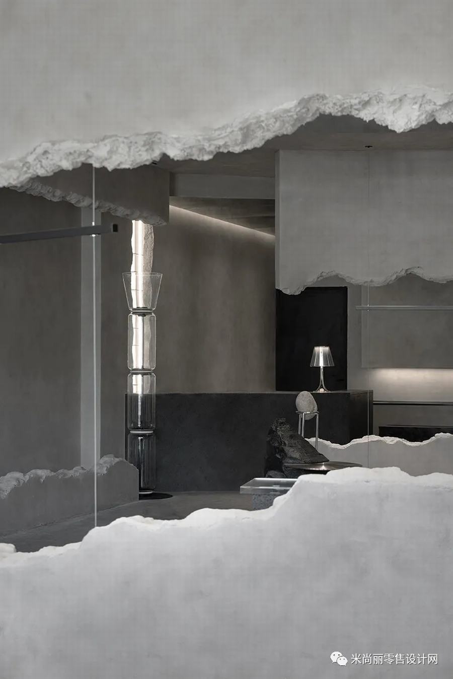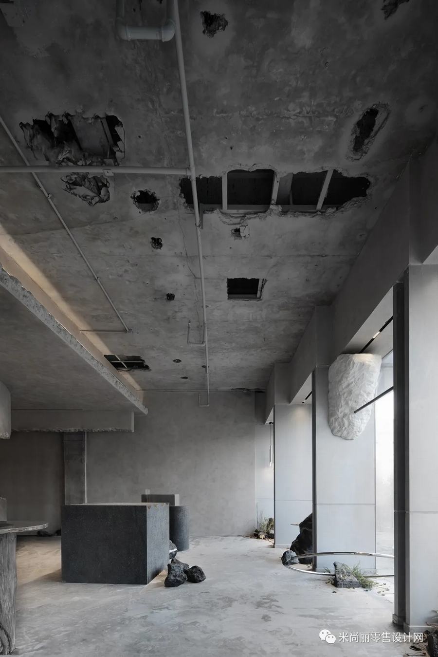 设计师的灵感来自美国艺术家 Daniel Arsham,也受到 Arsham 未来考古风影响。他们在设计上保持了原有的建筑效果,也创造了一道裂痕墙,在表达空间中的考古空间的同时,将一堵墙当作一道屏障,斑驳的墙被一种牵引力撕裂。当连接天花板和地板的墙壁破裂,碎片坍塌时,另一个不同的世界会慢慢有序地呈现出来,就像这是一个破裂的废墟世界,也是空间与空间的交点。