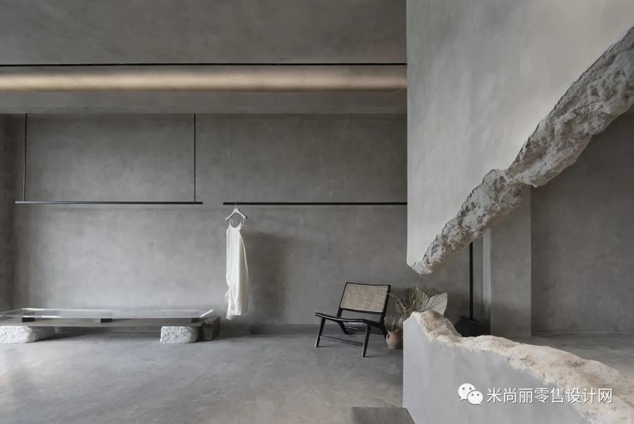 整个空间与周围环境“格格不入”。它们就像废墟,但它们是如此不同。它在精神上独立、坚定、沉默。斑驳纹理的墙壁从上到下对称地裂开。虽然它们是分开的,但它们形成了对应的关系。人们可以从裂缝中窥探一切,仿佛可以从裂缝中看到未来的世界。同时,也是为了响应设计向业主和相应的消费群体展示,他们都有着独特的审美、独特的视觉,以及不同的世界观。