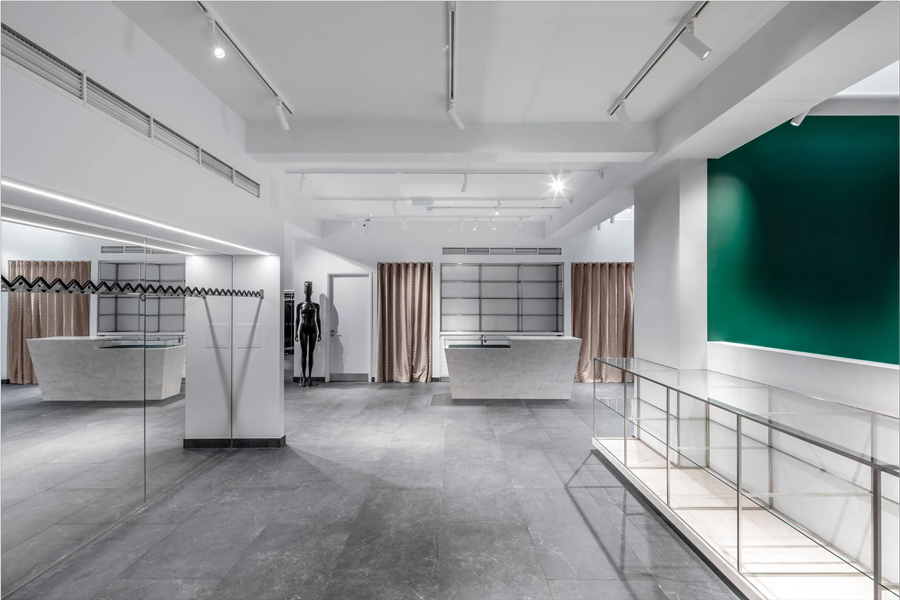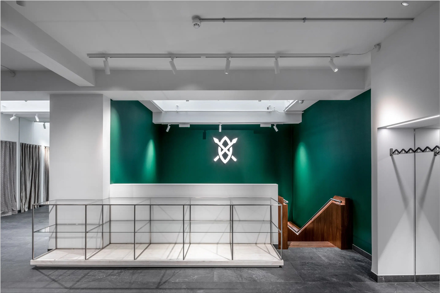 设计参考三个人的祖国,鉴于整体干净和实用的设计的场所需求,空间由质朴的白色墙壁、绿色色调的部分交,大镜子,石头瓷砖地板,玻璃和钢架子组成。木材覆盖的楼梯通向地下室,有着类似的美学,尽管浅色的石头瓷砖地板赋予了它更柔和的边缘。