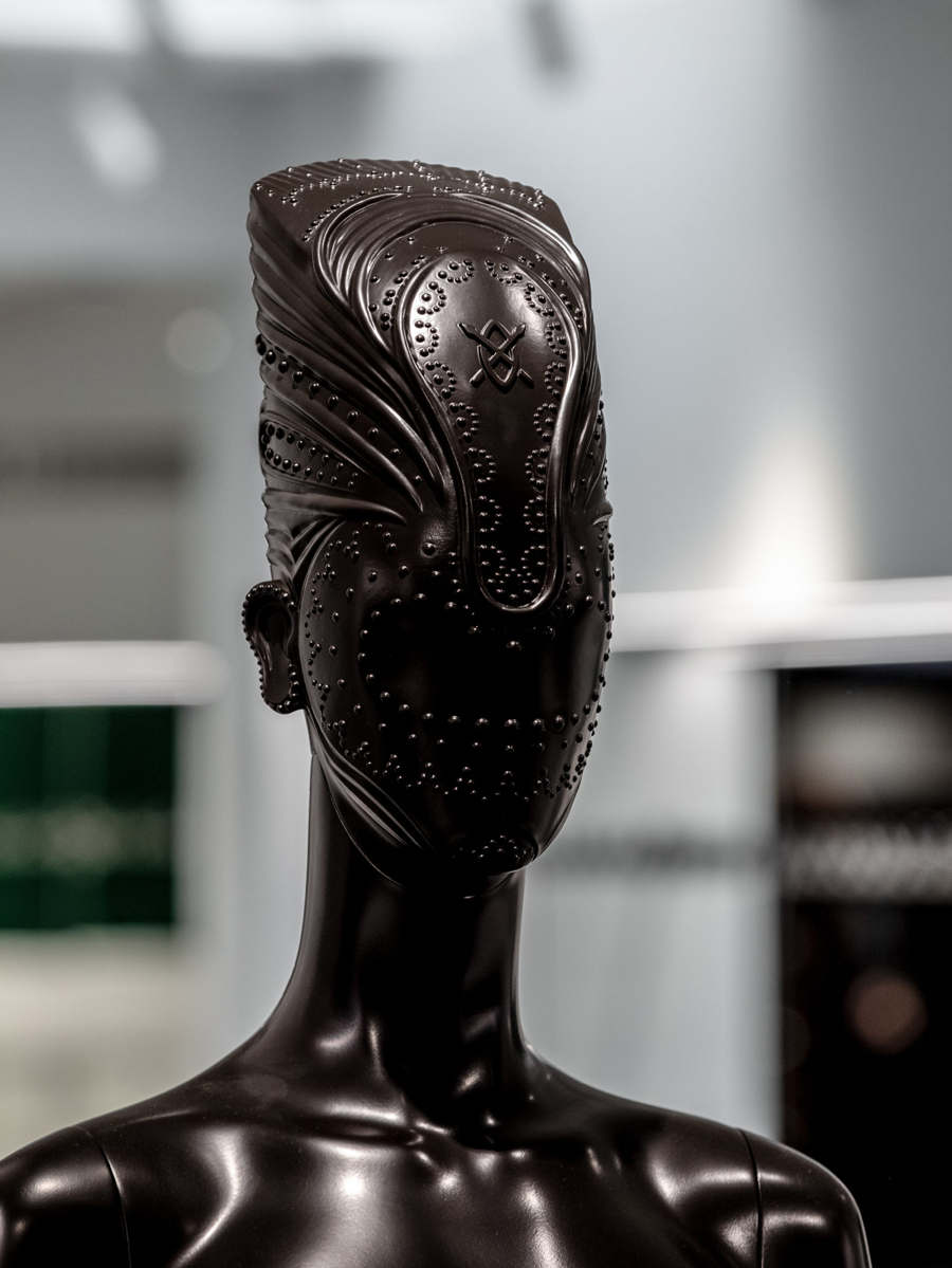 店铺最引人注目的是入口处描绘的三角形徽章和一系列定制的努比亚人体模型。