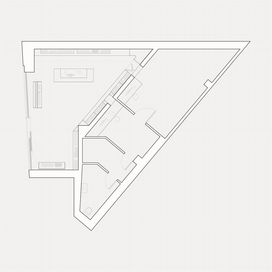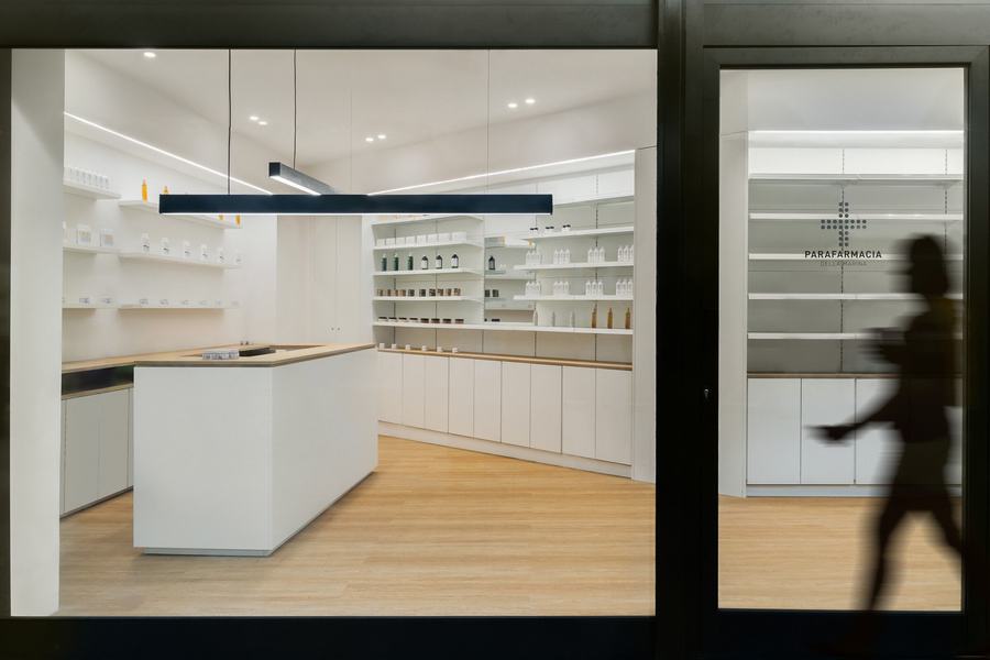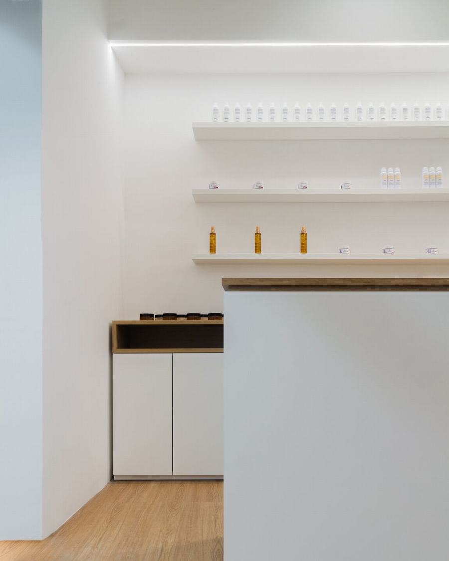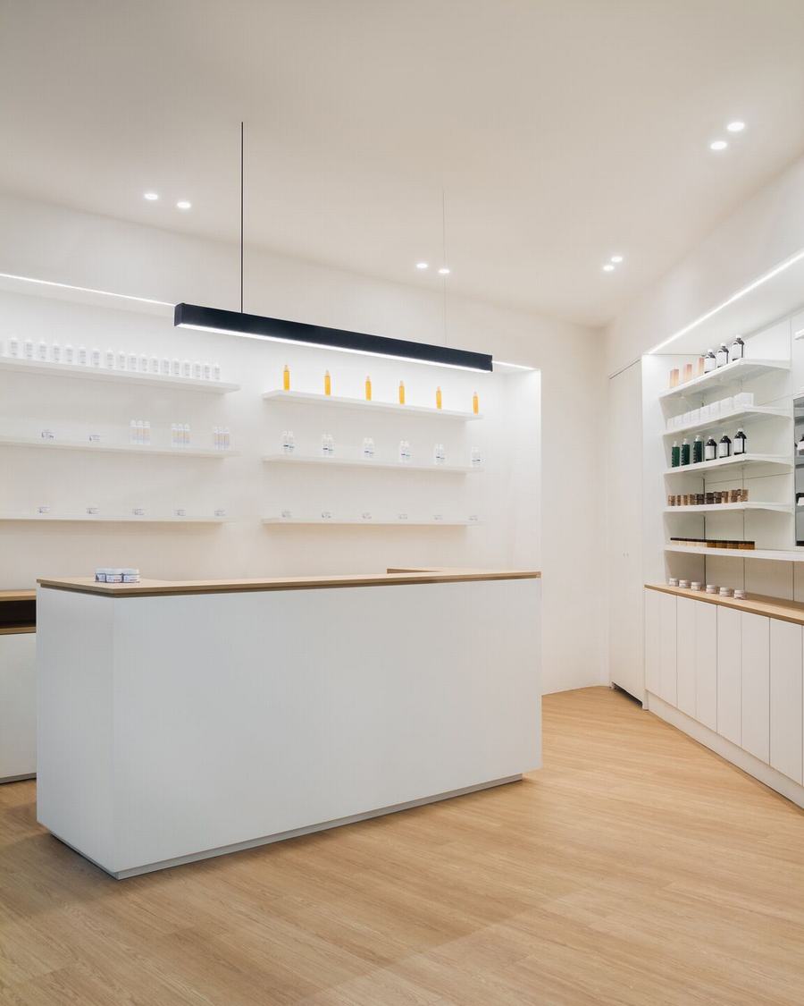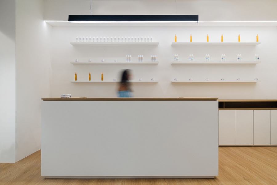 这是一家与众不同的药店,整个空间采用了极简的设计风格,倾斜的墙壁让空间变得不规则,暗示了定制家具的使用。当你第一眼看到这个空间的时候,一定不会联想到他是一家药店,更像是一家化妆品店。这种特殊的设置,弱化了药店在消费者眼里的冰冷感。