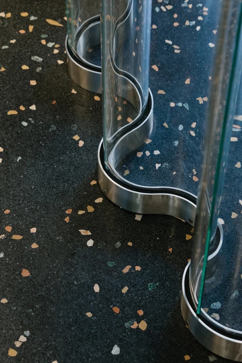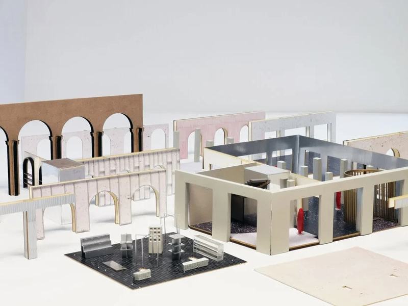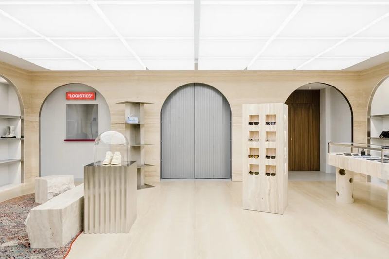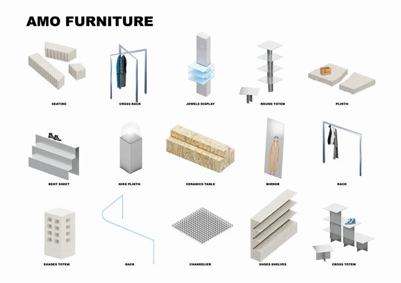 AMO的设计从三个层面展开,展现不同的空间体验,代表了off-white的多样性和三个典型的空间:庭院、画廊和市场。主入口引导着购物者穿过半圆形的波纹玻璃前厅,进入购物空间。女性藏品陈列在这里,背景是含蓄而优雅的拱形图案和白色石灰华。它的设计旨在创造一个平静和缓慢的购物体验,也可以容纳动态事件,如时装秀。
