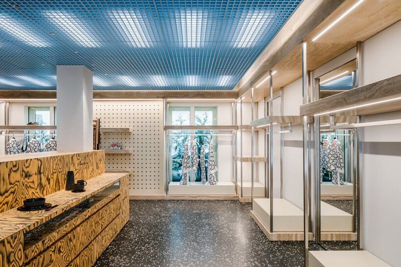 在旗舰店的入口提供了一个非常不同的氛围,浅蓝色的墙壁和黑色的水磨石地板。商店的这个区域展示了由AMO设计的off-white品牌合作的独立家具。二楼包括儿童和家庭用品收藏品,以及一个更私密的空间的展览墙,这个空间有低矮的天花板和小窗户。