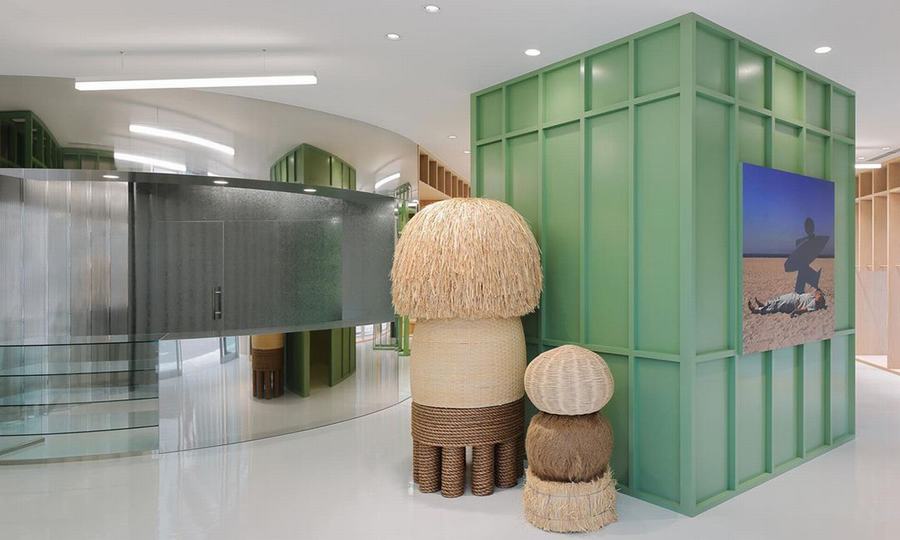 从Stüssy店内的绿色装置、浅色木板结构、丰富的盆栽、与稻草雕塑可以看出整体风格非常美式,似乎是将加州「沙滩」场景融入了繁忙的涩谷市区内。Stüssy(斯图西) 的涩谷门店已于 7 月 9 日在涩谷正式开张。