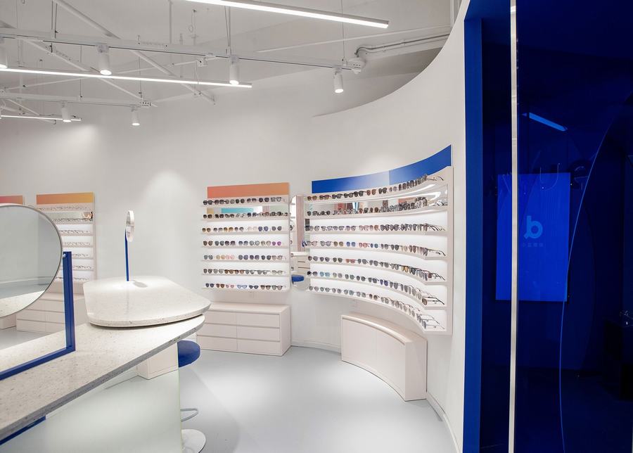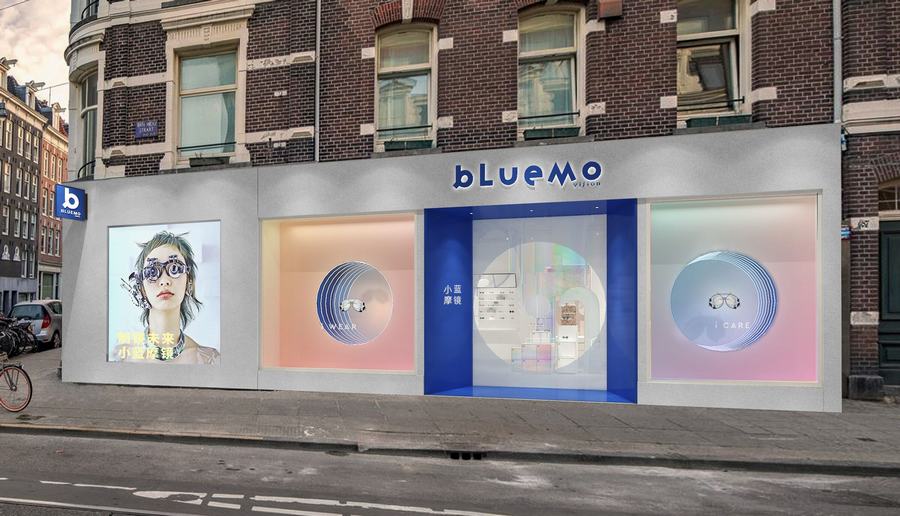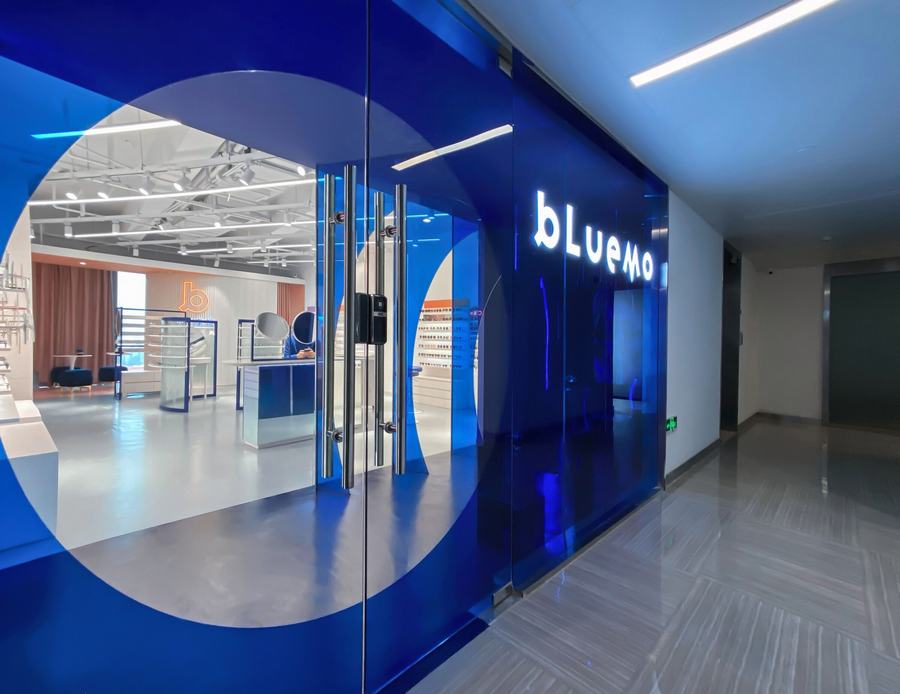 该品牌标准形象的第一个实践是BLUEMO 001,这是一家从其“工作空间”的一部分进行翻新的商店。BLUEMO 001位于中央商务区,是中国杭州最高的眼镜店。它还充当品牌的陈列室和附近白领的咖啡休息场所。