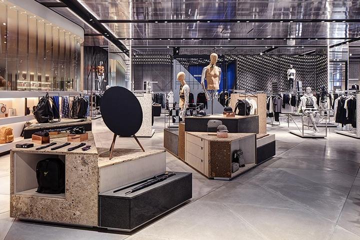 这家商店由三个区域组成。第一个——入口区——向客户介绍品牌身份。在这里,一盏由许多小型球形吊灯组成的枝形吊灯聚集在一棵活树上方的一个半球上,暗示着在星光灿烂的天空下航行。一面墙的背光品牌视觉展示讲述了它的历史和视觉DNA,完成了介绍。