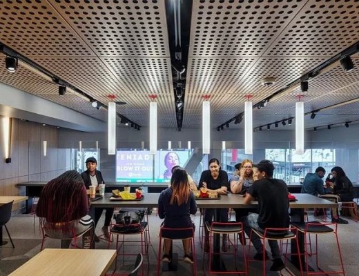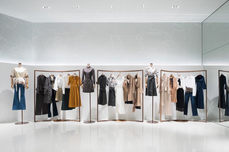 设计的第二部分是产品展示。水平的灯光设置在视线水平的浅壁架上,延伸到整个空间的墙壁周围,代表地球的地平线,引导顾客深入商店。在上面的墙上,由日本插画家Chalkboy绘制的图形描绘了世界地图的一部分。即使是柔和的拱形木制展示栏,也在一个柔和的框架内展示衣服,强调了空间的女性复杂性。