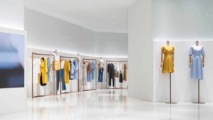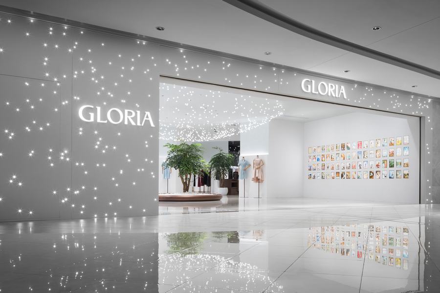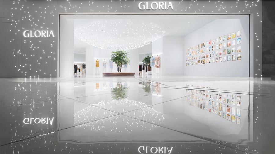 这个290平方米的概念店是为了向世界介绍中国女装品牌Gloria而设计的。日本工作室I IN在购物中心走廊的商店入口用强烈、大气的视觉表达完成了这一点。