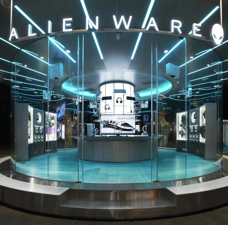 Alienware快闪店位于杭州著名的世界文化遗产西湖湖畔步行街。我们的第一个想法是,为了充分利用场地,商店应该从各个方向都可以进入。其次,作为一个快闪商店(pop-up store),我们希望它成为街道上最显眼的地标性建筑。