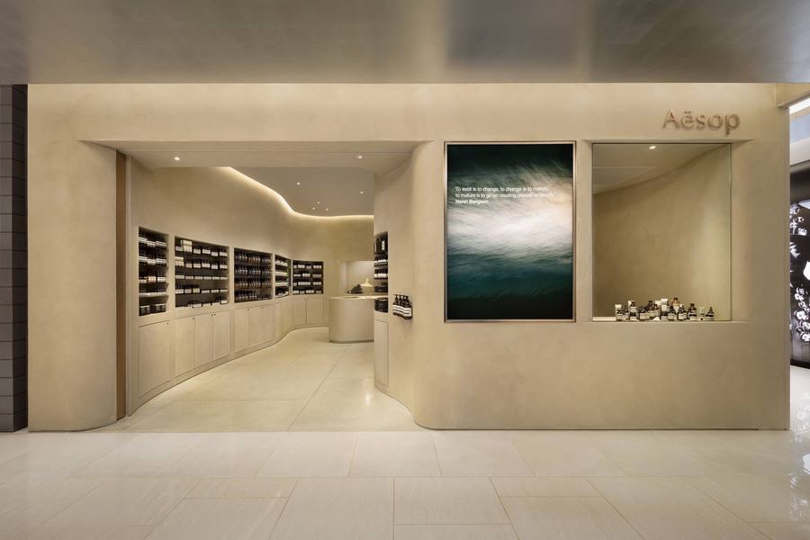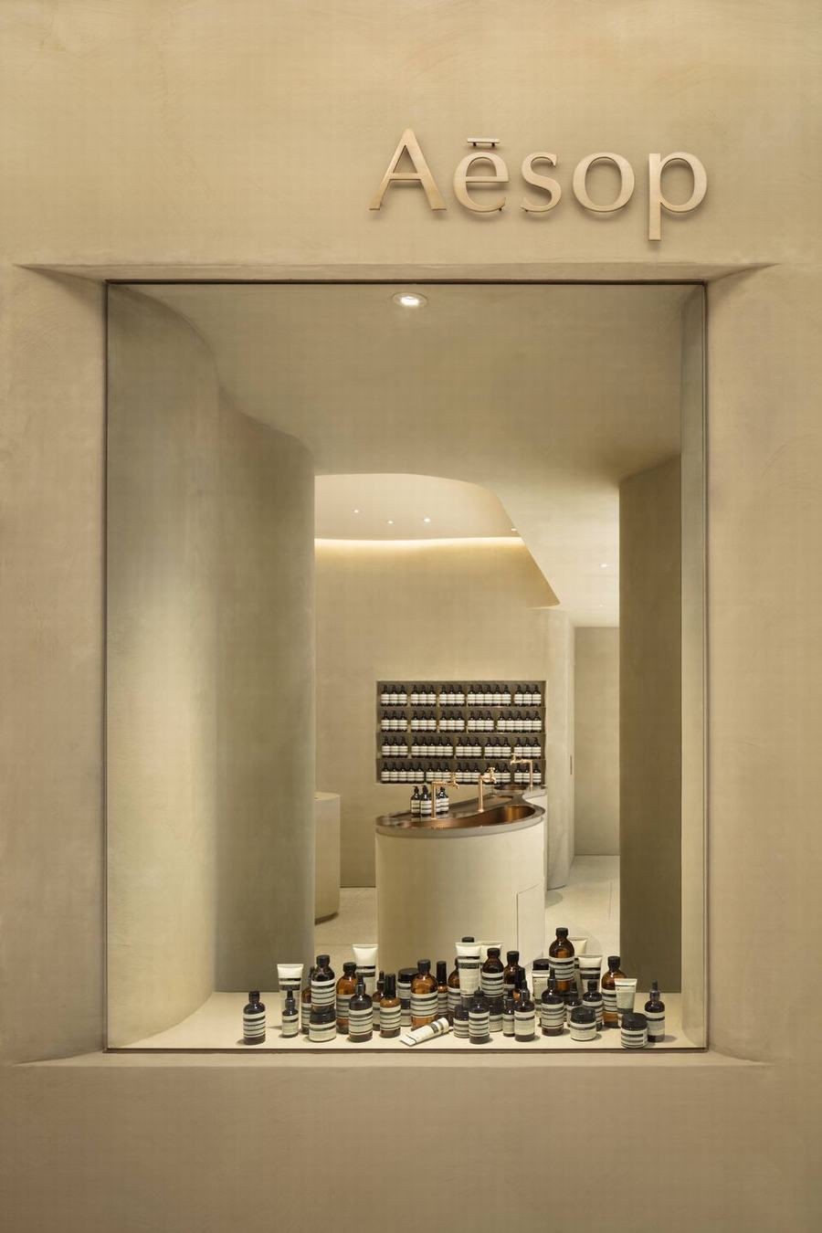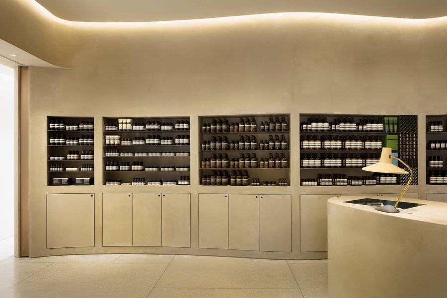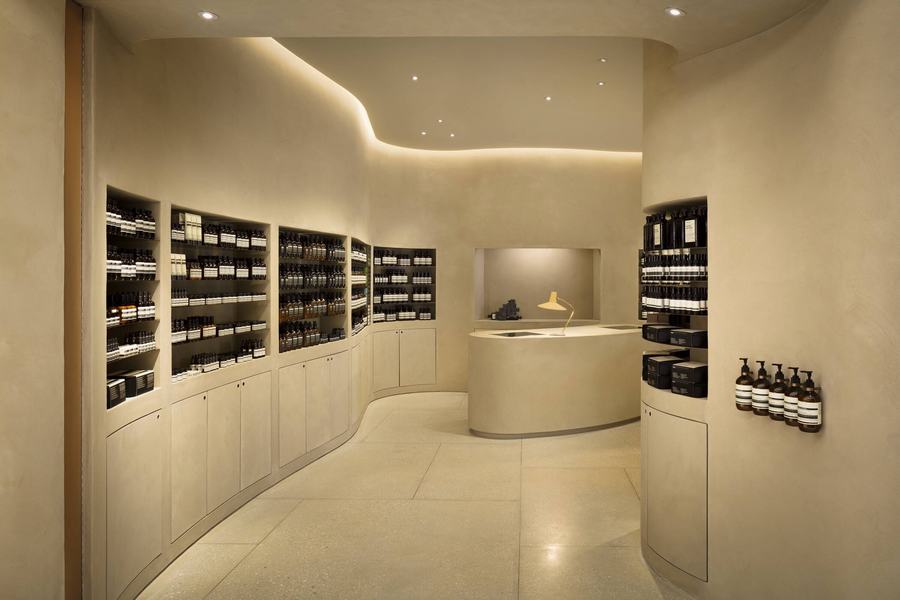 波浪形的有机墙形成了从一端到另一端的通道,而具有同样波浪形轮廓的岛屿充当水槽和销售点 (POS) 柜台,从而创造出柔和的流动线。为了使 Aesop 的产品脱颖而出,灰泥匠的专家之手将金色的铁架子小心地嵌入灰泥墙中。
