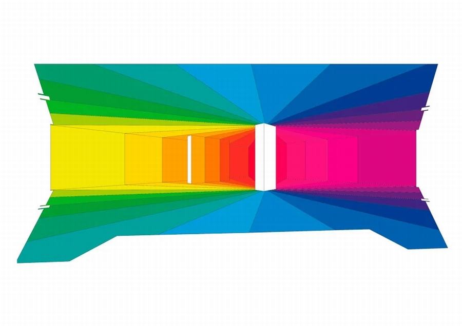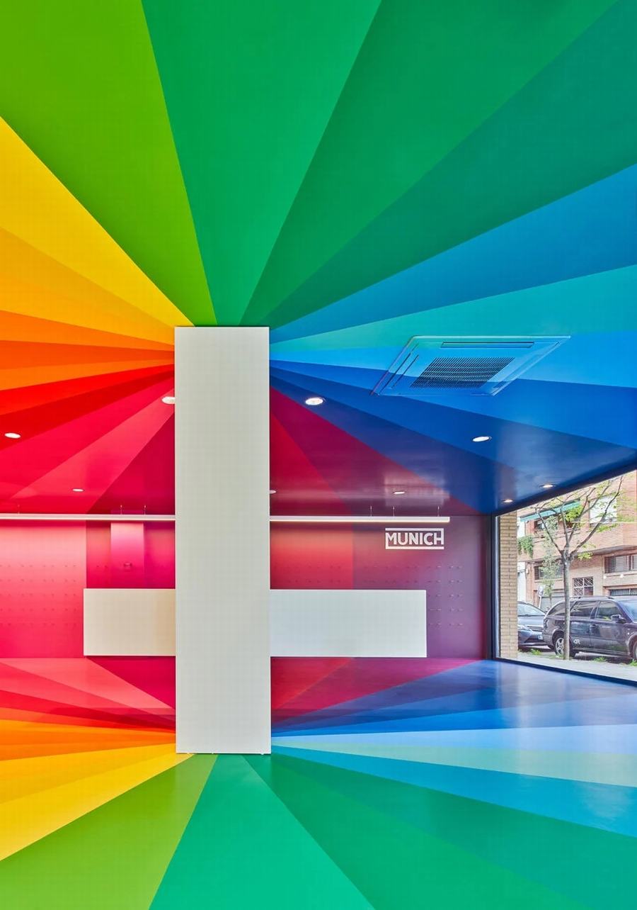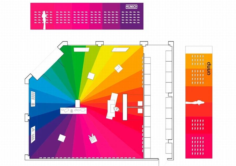 一个巨大的混凝土柱占据了137平方米(1475平方英尺)的商店的中间。比起试图隐藏柱子,studio Animal决定让它成为中心点。超过20种不同的颜色从柱中放射出来,就像一个棱镜,将白光折射成彩虹。通过这种方式,建筑师试图唤起慕尼黑运动品牌的运动和活力。