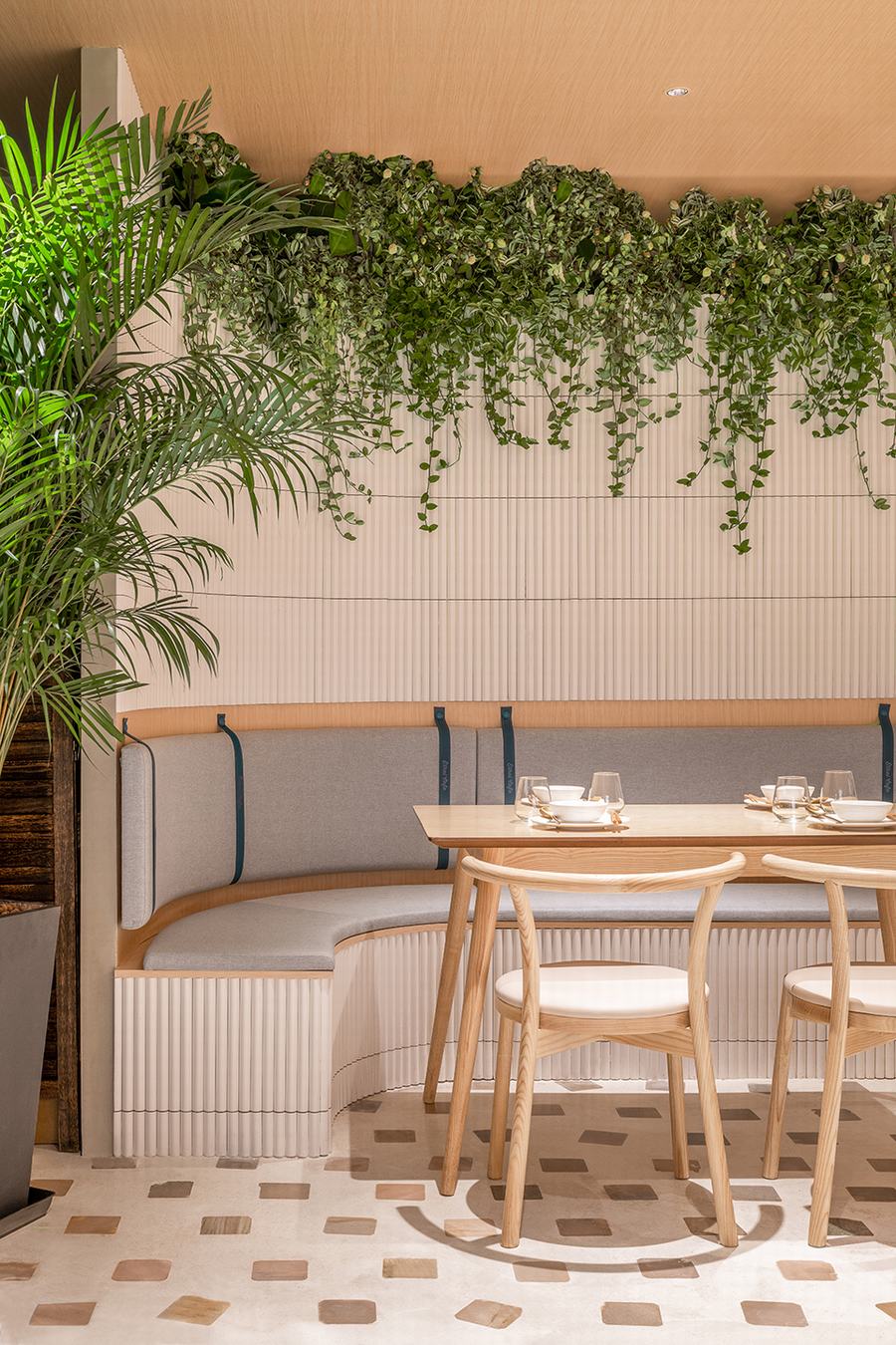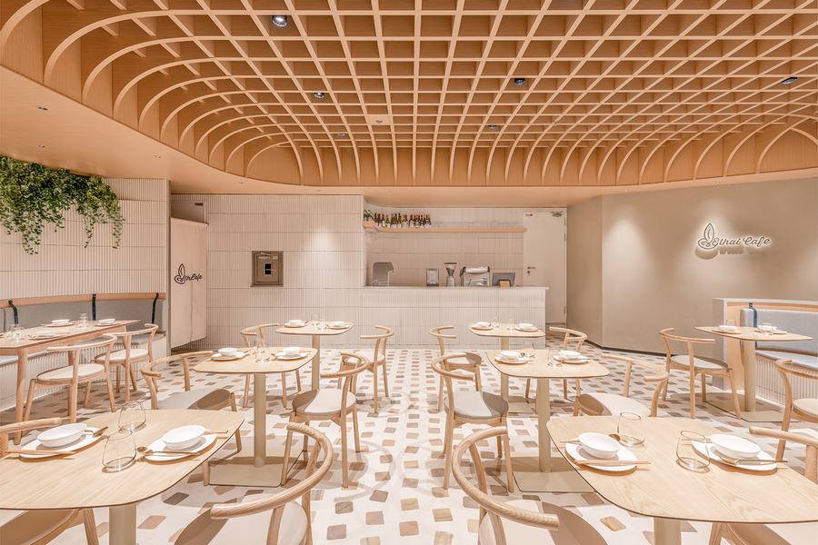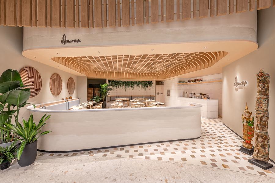 材料的选择进一步加强了这种安静的清醒的想法,部署了丰富的泥土色调和交替的粗糙和光滑纹理的调色板。在入口的夯土坡地的欢迎下,顾客注意到粗水磨石地板引导他们进入空间。进一步提升他们的视线水平,他们会发现垂直表面上丰富的纹理,覆盖着白色的拱形瓷砖。同时,家具的木质表面和网格天花板以及植被给人以自然的感觉。最后,几件艺术品构成了餐厅的不同焦点,带来了传统的泰国风格,并最终确定了Ethai Café的完整性。