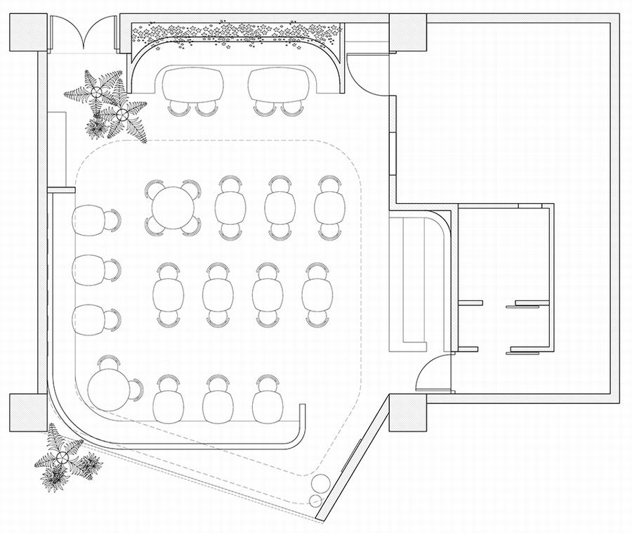 考虑到场地的隐蔽和约束性质,我们设想了一个可以提供一个宁静和短暂的空间,远离喧嚣的城市生活。为了实现这一点,该项目遵循了包络几何的方向性概念。因此,立面的设计是自愿的,通过降低的天花板和矮墙,从餐厅内部像缎带一样展开,并悬挂在外部,从公共区域给空间一个轻微的切割。矮墙的开口,揭示了内部的长椅,创造了一个诱人的入口,自然地引导顾客进入空间。这些体量与场地边界轻微偏移,加强了“空间中的空间”的感觉。这种布局给了客户一定程度的隐私,同时仍然感觉与其他公共空间有某种联系。俯瞰顾客的是一个由木梁网格组成的圆顶天花板,其中隐藏了空间的照明。这个结构定义了一个拱形空间,感觉既私密又欢乐,就像对原始小屋的当代诠释。