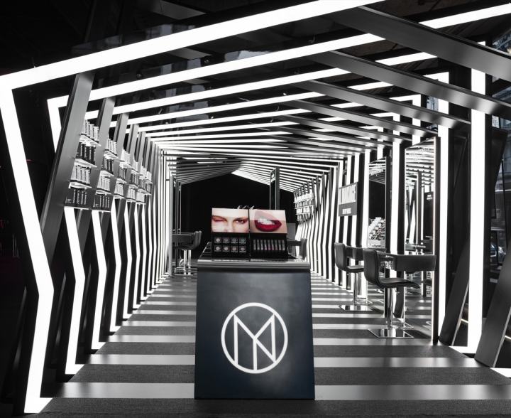 设计师设置了双向线性线,以拉伸客人线。 通过商场的自动扶梯到达B1走廊后,所有客人必须先穿过商店30米长的“窗口”,才能到达入口。 “窗”一排座位上的美女纷纷落座,长长的镜子遮住脸颊,只露出细长的玉腿高跟鞋,极具想象空间的画面占据了“窗”,她们身后的 流动的人物,构成无声电影,闪烁出意想不到的火花。