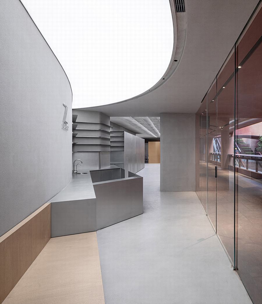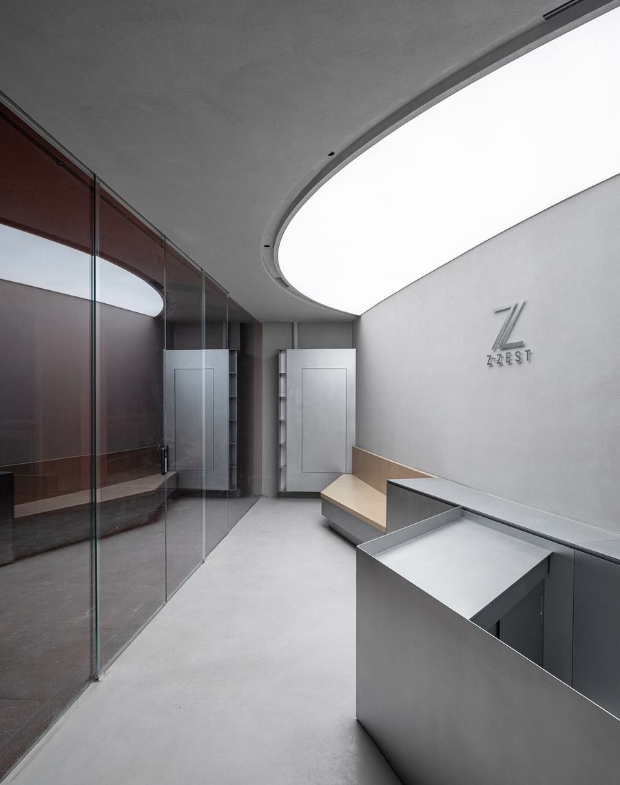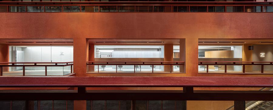 新Zest发廊位于上海最新的网红楼,由法国著名建筑师让·努维尔设计。(千红花钵道,上海,中国)这座建筑有着丰富而不寻常的外观,引人注目。立面采用了夸张的结构形态,覆盖着绿色植物,内庭则覆盖着红色纹理。视觉效果震撼而难忘。在这座充满热情洋溢的建筑中,Zest以低调沉稳的姿态悄然走进。Zest年轻而充满活力的气质与这座建筑十分契合,既热情又沉稳收敛,仿佛两个平行世界的空间在不经意间碰撞。重叠,一侧是火焰,另一侧是冰山,碰撞并合并。