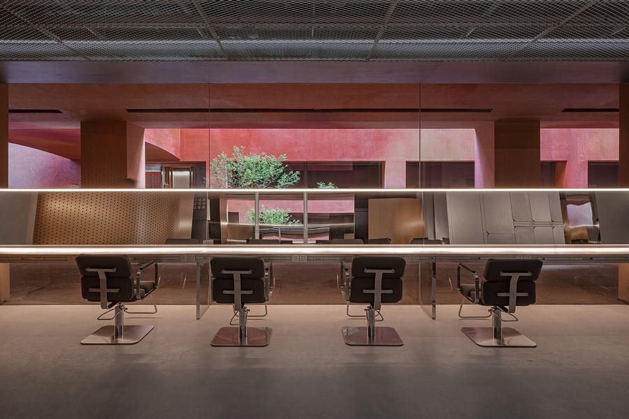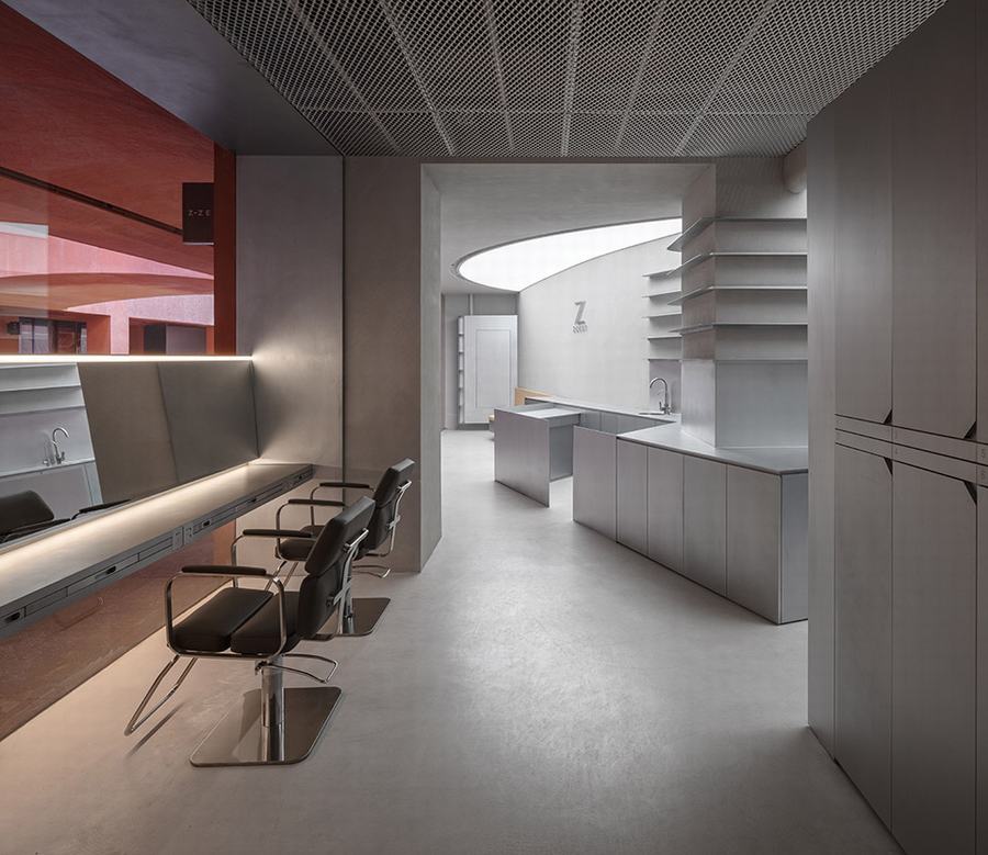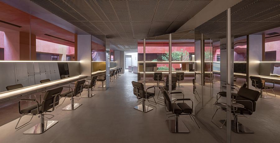 红色建筑本身就具有强烈的视觉辨识度和张力,色彩极为大胆。靠近街道的区域是周边建筑的米色外墙,用花瓶装饰,绿色与周围的梧桐树融为一体。中庭是中国风的红色核心,温暖而现代。Zest的所有设计都围绕着中庭的色彩展开。整个室内使用与中庭整体色彩相衬托的背景色——金属、水泥、沉稳、时尚。Zest 发型师的作品在那些中性色中更加饱和、生动和逼真。