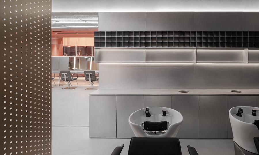设计师将主入口设置在第一排,原主入口最难处理的弧形墙,配合软膜天花照明,水泥色墙面成为照片的背景色。定制的展位围成一个弧形,为等待客人提供休息的场所,而咖啡区则是相邻的。第二和第三部分用作热染区和护理区。两段接近18米长的浮动桌,隐藏着各种器官,满足客人和发型师的所有需求。