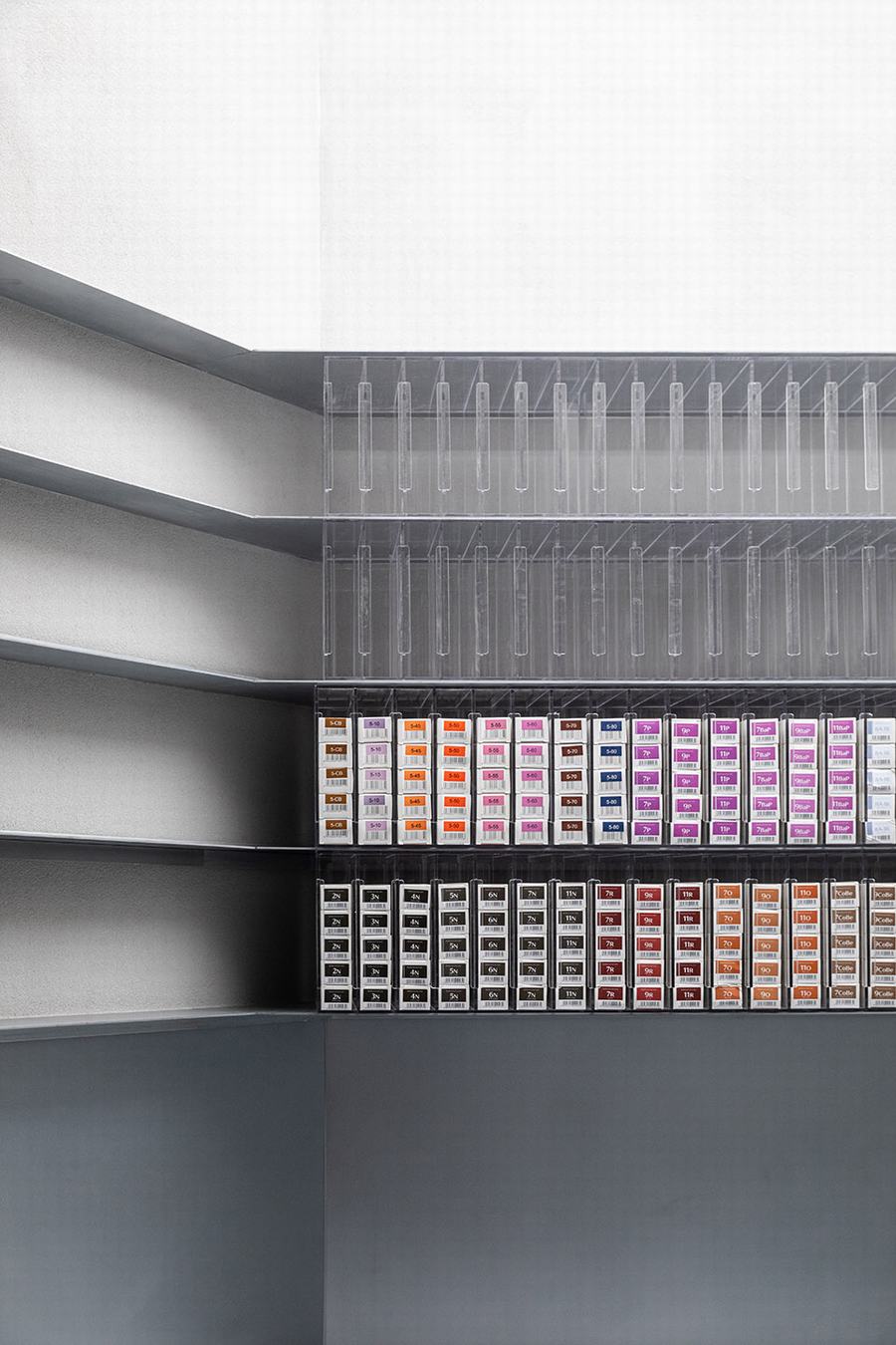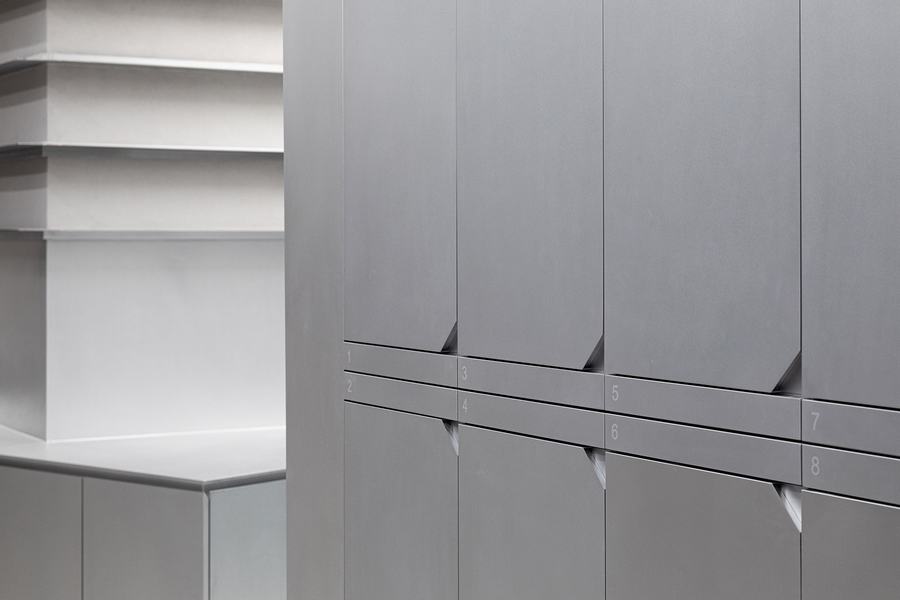 Zest在平面布局上延续了通常的线性布局,所有的发椅都排成一条直线。 设计师在空间洞的最深处设计了每个人都必须经过的洗发区,让每一位顾客都必须穿过整个商店才能到达目的地。 来回穿梭,搅动着店内的空气流动,冷色调的店里挤满了人,就像一条跑道。
