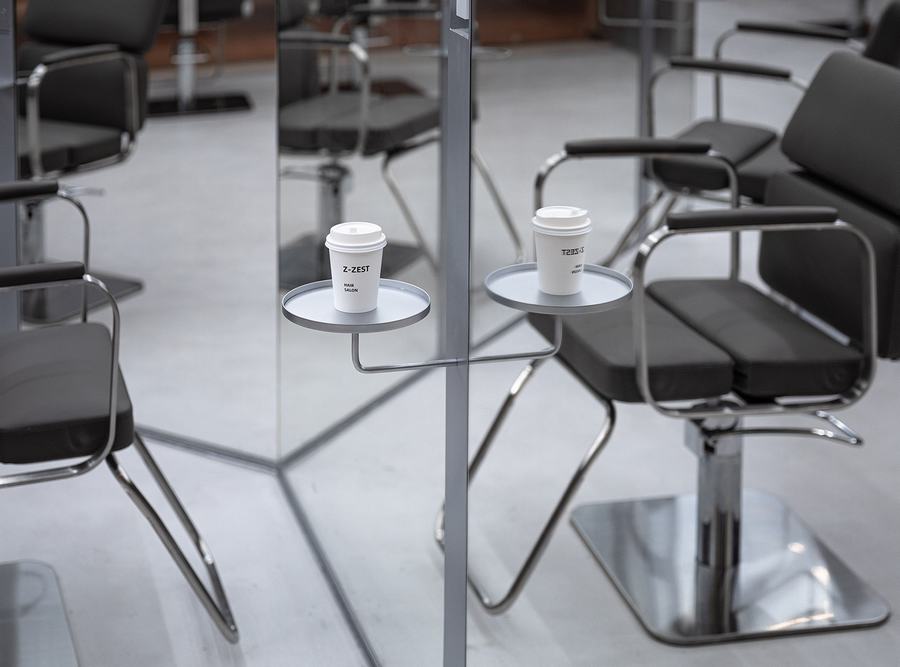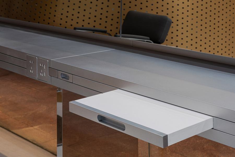 新店的设计非常注重细节,设有可手机解锁的储物柜;染色区浮动台左右两侧设有USB电源插座。桌子里面有一张小桌子,可以拉出来放手机或iPad,让客人可以在美发的时候打发时间看电影和玩游戏。同时,还可以放置咖啡和小吃。可以另外放置吹风机的小抽屉也同时隐藏在其中。