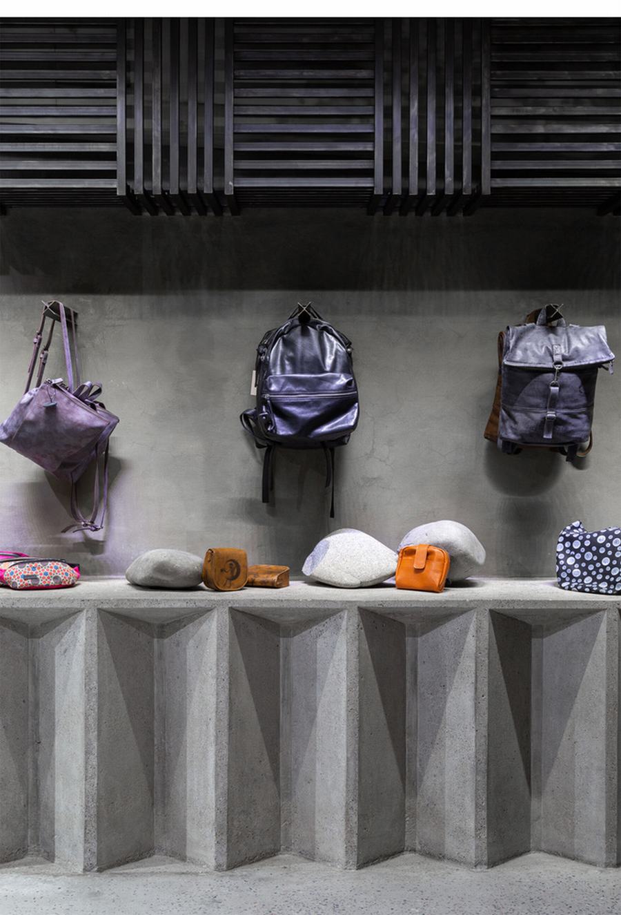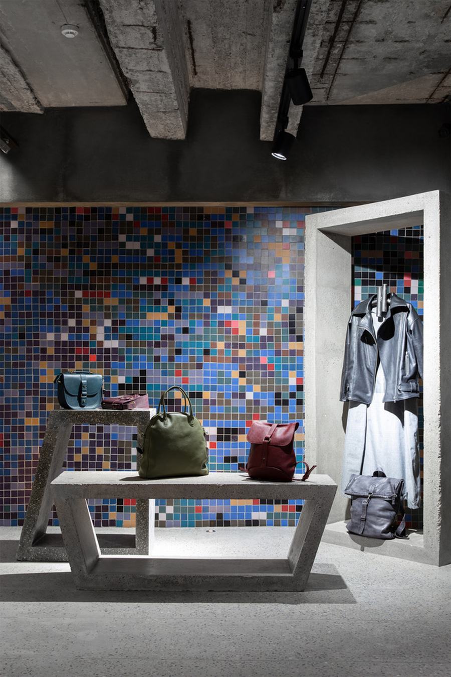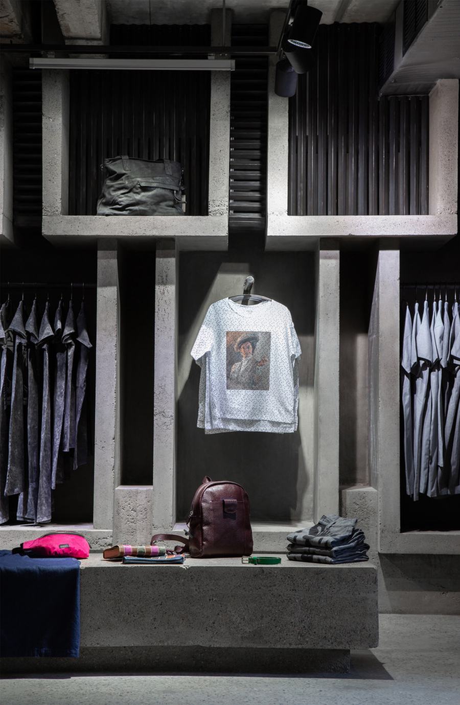 主要的想法是将塔什干的现代主义建筑转移到商店的内部,这样房子的外部和商店的内部看起来是有机的。在商店的中央部分,有一个附属区域和一个收银台。店铺左边是皮具区,右边是带小庭院的服装区。
