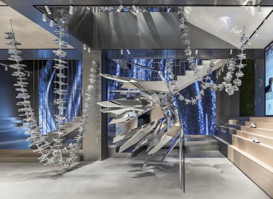 植物平衡了技术驱动的功能,比如迎接游客的多层屏幕,以及亚裔美国艺术家Juju Wang的艺术装置,为消费者的体验带来了不同的层面。其中一个是金属机械雕塑,参考了Ecco的工厂和生产过程,而180平方米的透明皮革制作的作品则借鉴了自然和波浪图案,邀请人们探索这种高科技材料的特性。员工可以利用在商店的多功能区域设置的活动墙,以满足不同的销售和活动需求。