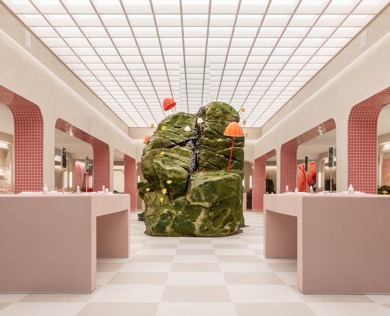 该设计参考了太平洋西北地区的景观,特别关注真菌的世界——一个有趣的、苔藓和蘑菇覆盖的装置在粉色空间的中间,立即让人想起爱丽丝梦游仙境。与绿色体量相呼应的是蕨类植物色的分层座椅设置,吸引顾客放松和社交。粉色瓷砖、超大棋盘地板、网格天花板照明系统和脊顶家具呼应了Glossier以千禧一代为目标的可识别的玫瑰色品牌。