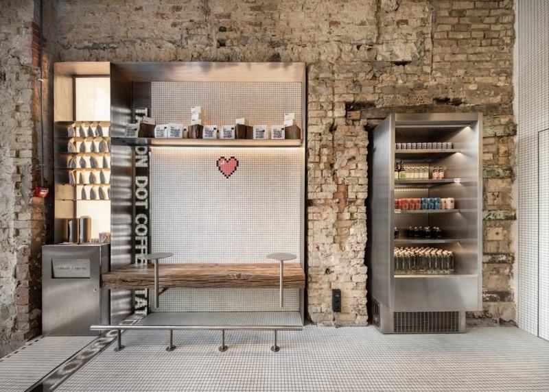 由葡萄牙公司Cinca用瓷砖制作了另一幅类似粉色心形表情的马赛克壁画。它被展示在小座位区域上方,这里有不锈钢凳子,与冰箱和其他金属装饰相匹配。DOT 咖啡的显著特色还包括一个窄屏幕,可以滚动字幕,在地板上从一面墙蜿蜒到另一面墙,为咖啡吧增添了数字主题。