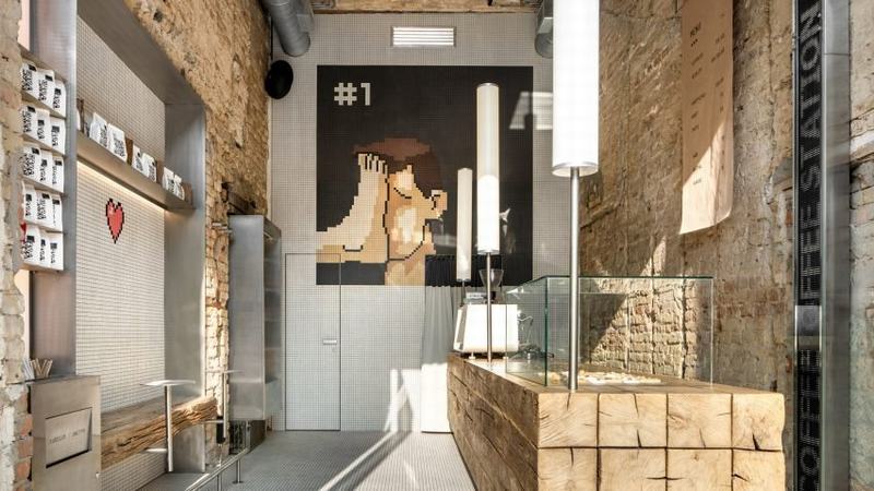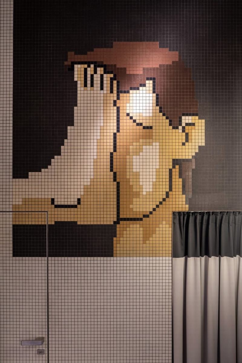 咖啡馆的突出特点是YOD 设计的大型马赛克,它的设计类似于数字屏幕上的像素。这幅诡异的马赛克画描绘的是一个人在做“足掌”手势,而不是掌心。设计师说,这是为了让人产生共鸣。