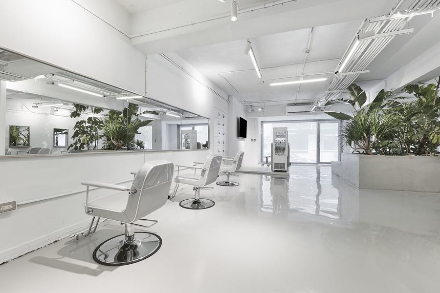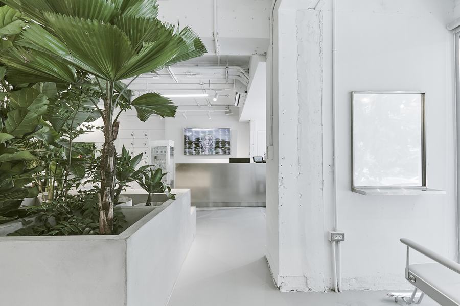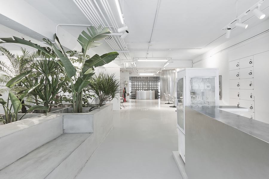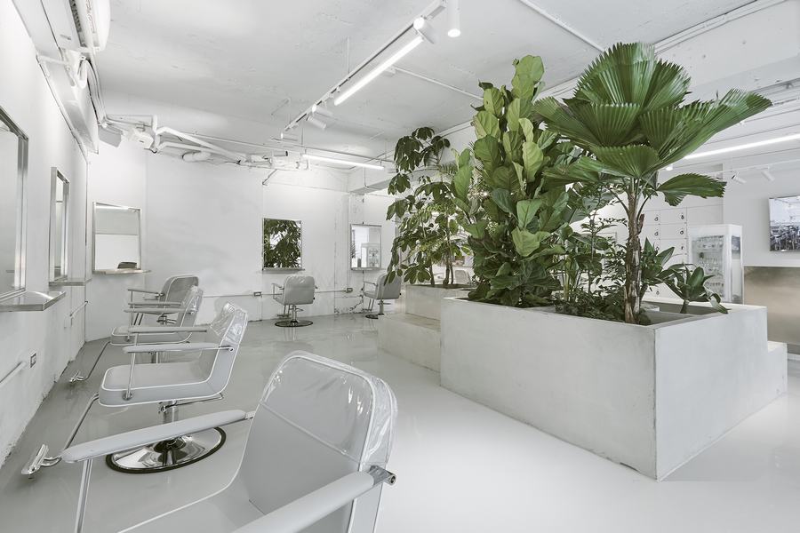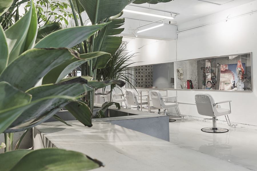 整个空间的一切都涂上了淡淡的冷色,地板和混凝土平台有着一致的灰色和粗糙的纹理,接待柜台和不锈钢工作台面采用了冷灰色的色调,呼应了冷白色的灯光和墙上的几何镜子。户外阳台上的漂浮厂房区域由废弃的水泥管、沙石、碎石铺砌而成,室内材料多为再生产品。W+沙龙是一个生命的“实验室”——在“加法”与“减法”的权衡中,创造了一种令人振奋的美丽体验。
