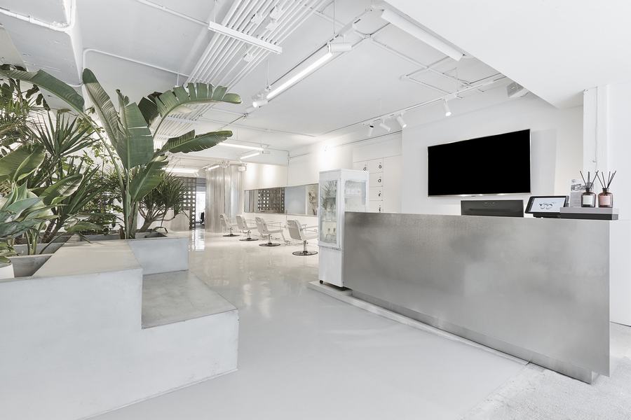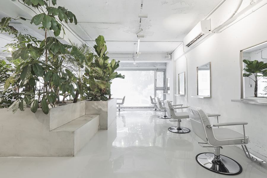 沙龙的外墙采用落地玻璃。室内和室外景色的相互作用创造了广阔无边的视野。当人们走进入口,迎接他们的是混凝土平台上的室内绿色花园。混凝土平台以一种自然渗透的感觉隐藏了视野。还有一个水泥墙面屏风作为房间的分隔物,墙壁上布满了圆孔,通过孔创造出一种穿透性和诱惑性的视野。