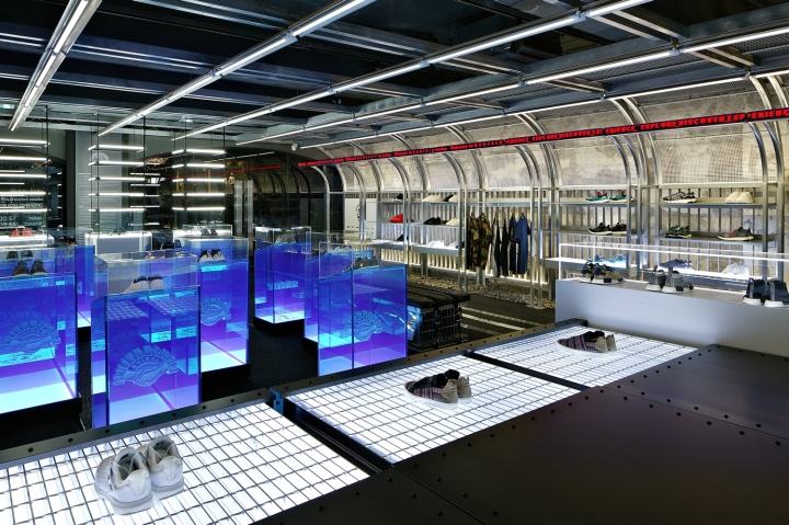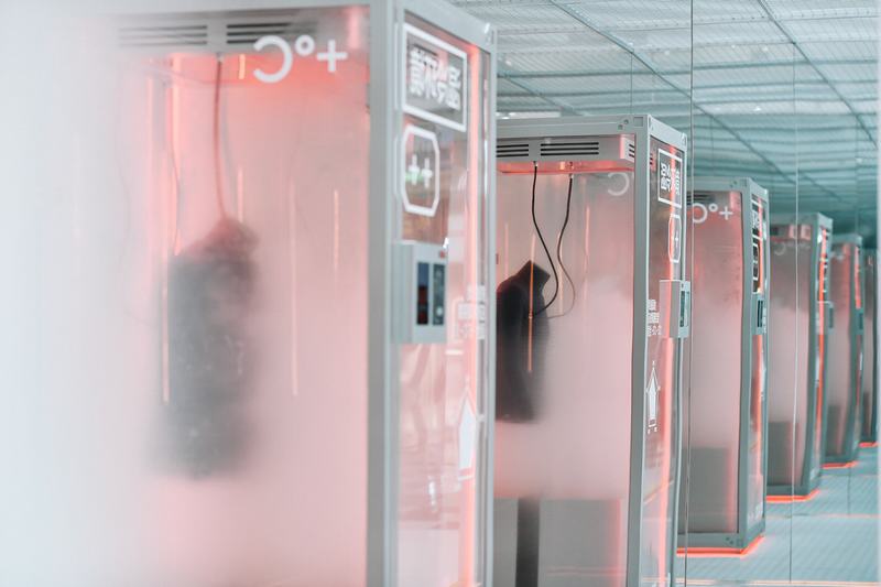 快闪店里三组互动环境舱,舱体造型以热皮品牌CG视觉片为灵感来源。互动体验提炼了热皮针对风冷、湿冷、雪冷三个典型的气候环境,研发的系列产品进行功能表现,设置了对应的吹风、喷雾、落雪三个互动体验舱。通过体验者将手掌触压热皮触控面板,触发互动。同时舱体间的灯光渐变和无限镜装置,延申了视觉感受,丰富体验。