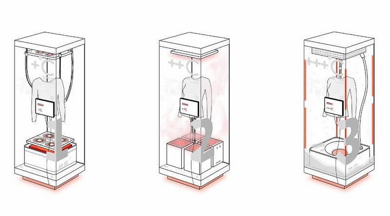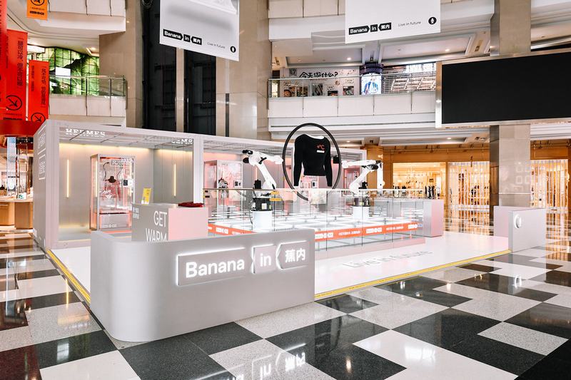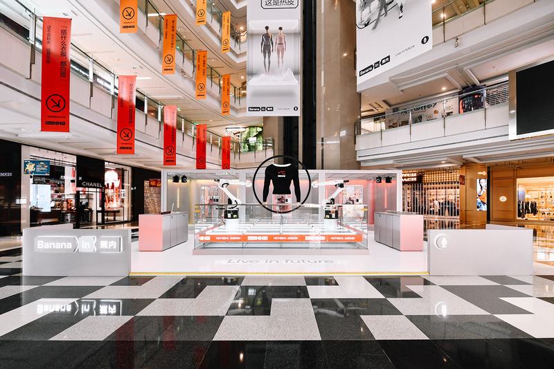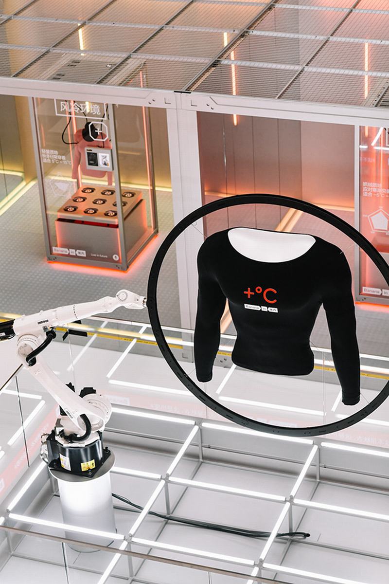 『Air warm Pop-up store』是NOWHERE为蕉内品牌推广设计并开发的线下快闪店装置。快闪店装置位于商场一楼中庭,场地占地110㎡。在快闪店的设计上综合考虑了商场照明环境和人流动线,由机械臂热皮演示区和三组互动环境舱构成一个半开放式的空间。
