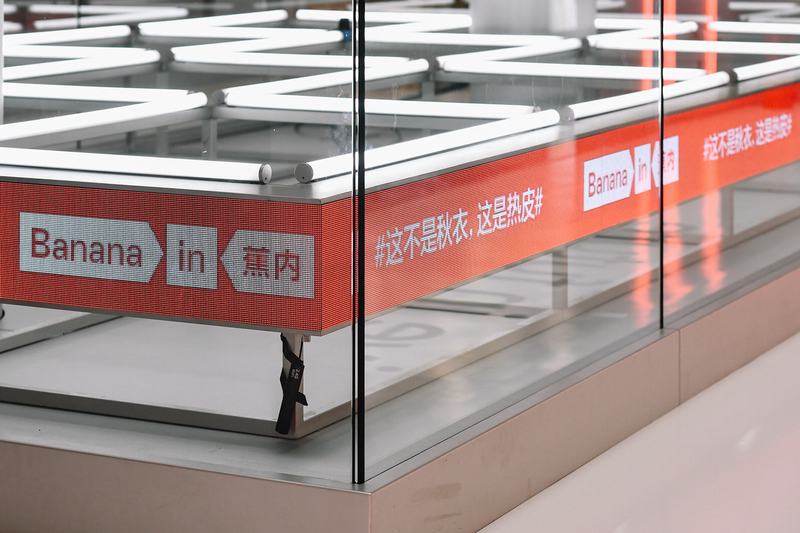 快闪店里的机械臂热皮演示区,由环绕式长条LED屏幕和栅格铁架组成基座,四面设玻璃围栏,简洁通透。两台机械臂协同工作,支撑穿着巨型热皮的半身模特,在系统规划的轨迹上完成运动。