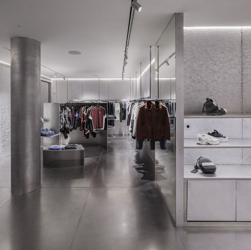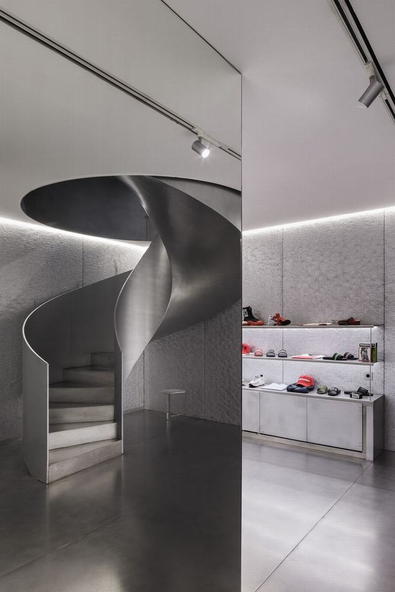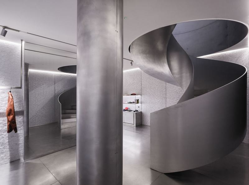 品牌集合店MKR对已有的商店进行了翻新,翻新是由于客户对空间有新的功能需求和新的形象升级的需求。新翻新的空间通过在地下室和地面平面覆盖的地方插入螺旋形楼梯连接起来。这个螺旋楼梯,作为一个巨大的螺栓,成为旋转轴,使两个楼层的铰接流畅地衔接。