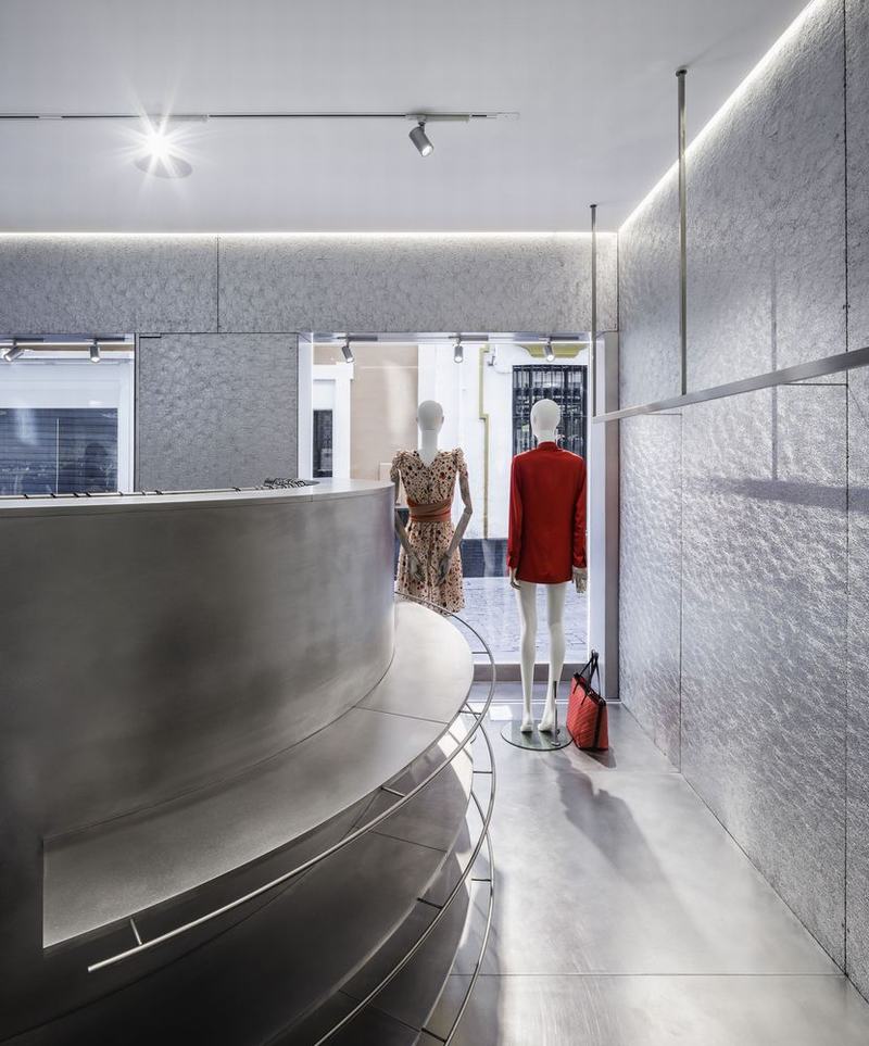 设计师除了对新的空间从新组织,该翻新项目试图引入同质性和连贯性的展览和销售空间,但是原有空间一直没有一个明确的设计或陈设策略。这就是为什么设计师要重新分配和使用连续的垂直泡沫铝衬里的原因,目的是为新空间达到相同的和当代的形象。泡沫铝在空间中一直是主要的使用材料。