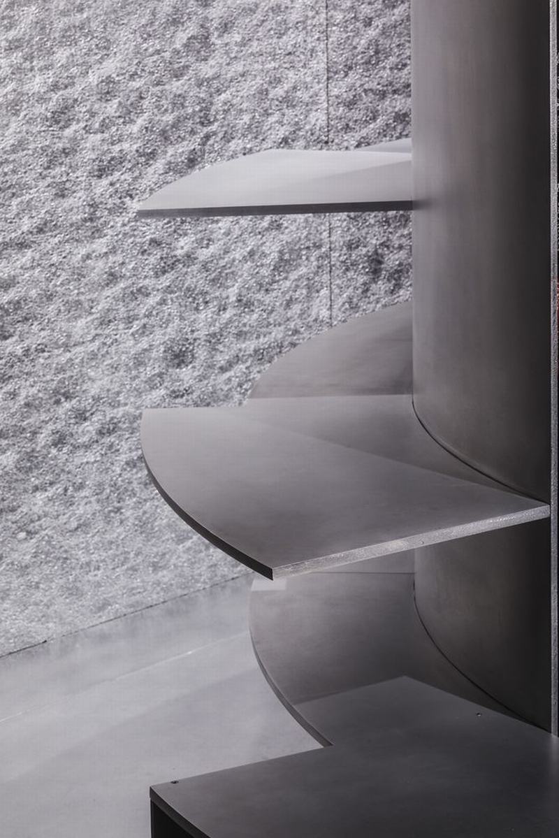 空间中楼梯的位置和轮廓在空间很重要,这两个位置决定了两个大型展示架的正式配置和位置,展架通过不同高度和不同直径的曲线来定义,这些曲线曲线展架叠加在一起,为向公众展示的不同物品提供内部厚度。