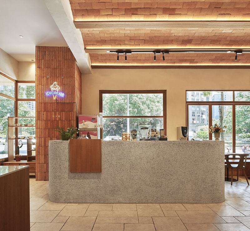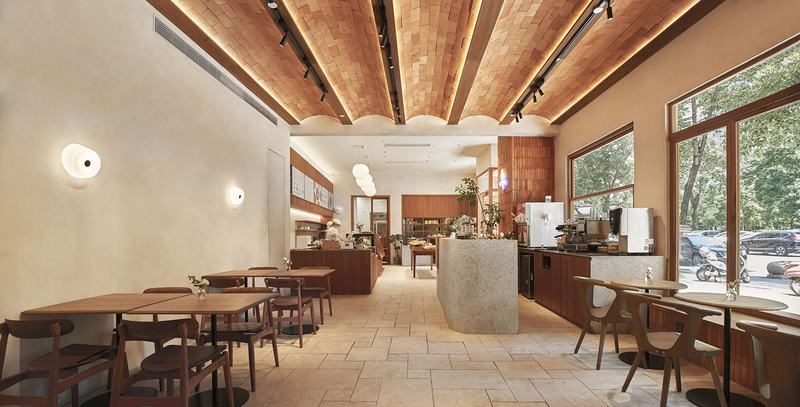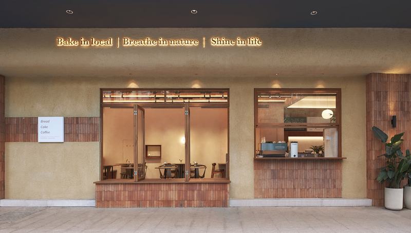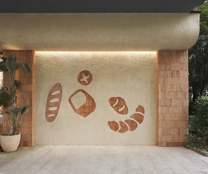 艺术家:你可以通过面包感觉到面包师手的温度。通过工匠般的材料的融合,感受空间的温度。我们以面包店为原型,提取“天然粘土”、“粘土砖”等天然材料作为立面和空间的主要元素。我们希望空间能像Cycle & Cycle的面包一样,给客人带来简单的温暖和高品质的舒适。这家商店有一个很长的门面沿着街道延伸。在立面的呈现上,我们采用几何立面语言,将两种材料在整体立面中融合在一起,表达品牌与客户共生成长的理念。