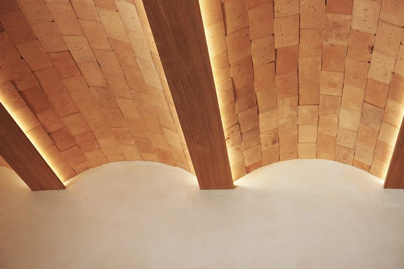 自然粘土和赤陶瓦也被用来形成外立面上手绘的面包图案。以粗糙的材质呈现柔和可爱的设计。我们喜欢这种有点尴尬的一致性。在靠近客人的室内空间,我们借用了传统的加泰罗尼亚拱顶,创造了“弯曲的砖拱天花板”。我们希望陶瓦砖在室内空间中更柔软。
