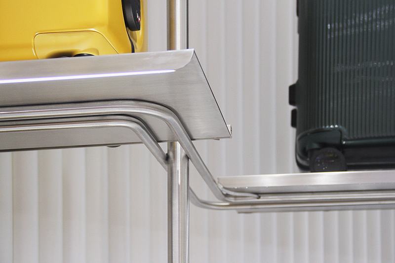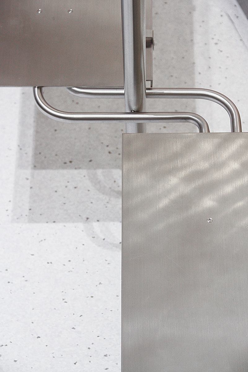 由于商店的空间有限,一个连续的架子沿着由丙烯酸管制成的墙壁组织货架系统,将产品展示推向空间的边缘,使中心空间更容易流通。连续不锈钢管水平和结构的货架系统。为了创造不同的显示角度,连续的机架在某些地方可以旋转45度。