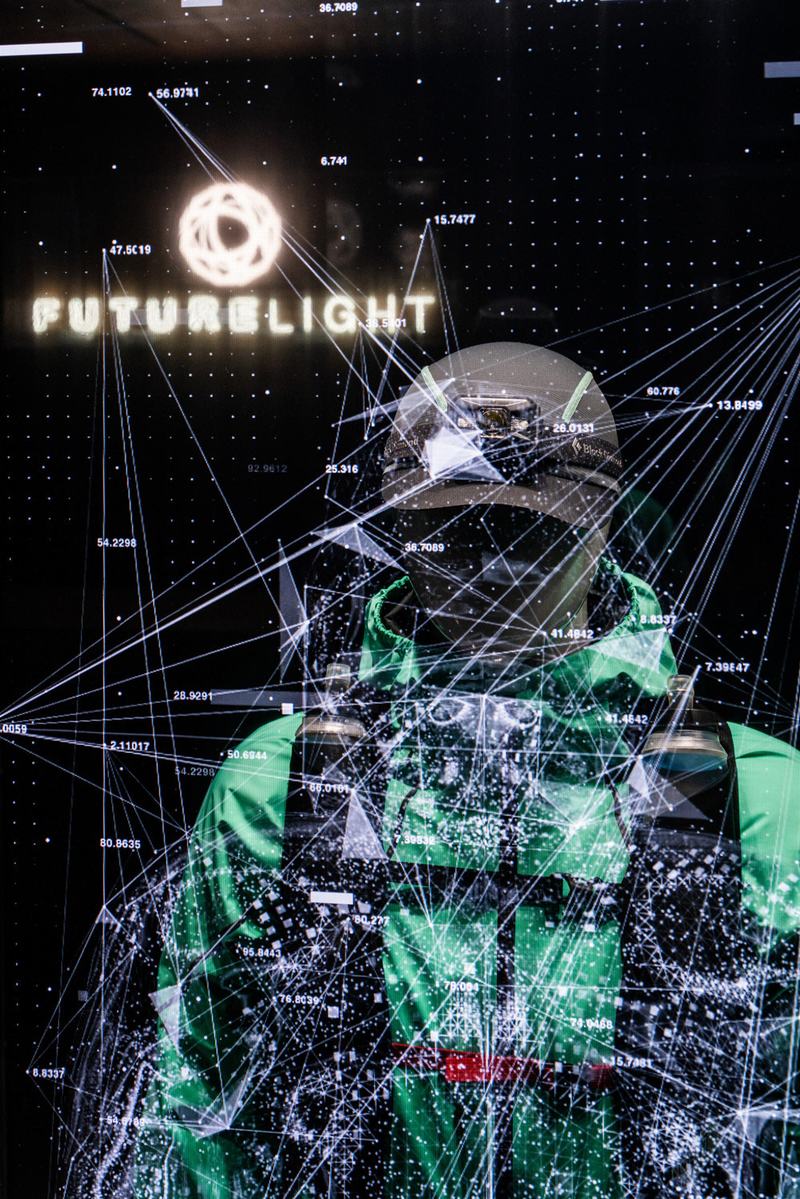 空间分为三个部分,中心区域采用了模特展示,类似橱窗,模特在玻璃后面展示,增加神秘感。同时采用导光玻璃和在玻璃上面贴充满科技感的数据图案,将产品的展示效果不断放大。两边空间主要陈列FUTURELIGHT面料产品。