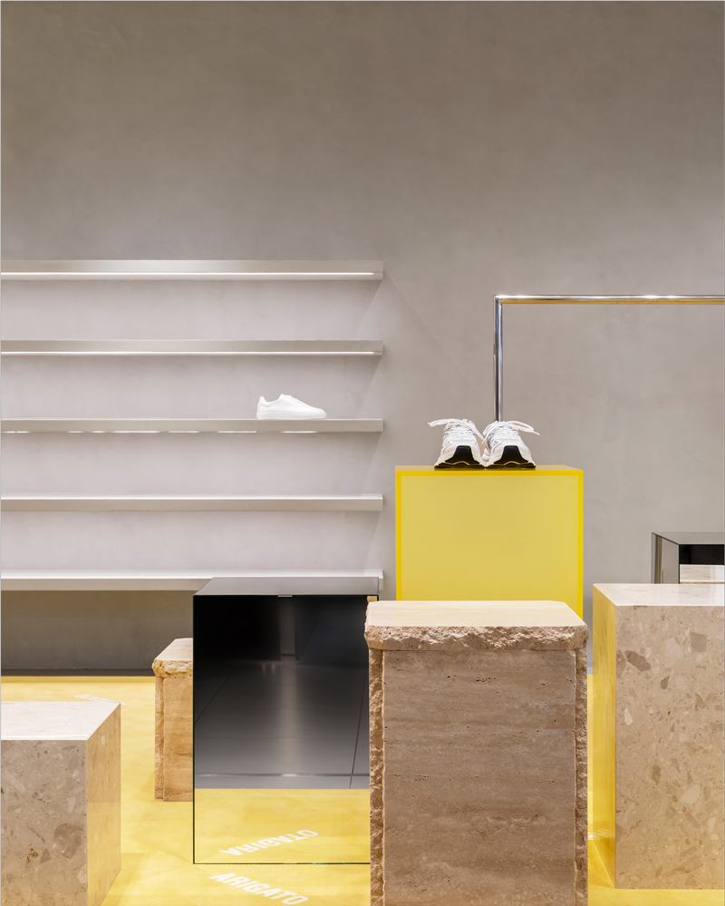 背景是混凝土色调的灰泥墙,无数的陈列品被放置在亮黄色的地毯上,地毯上装饰着品牌的名字,几乎和零售单元本身一样大。这些展品有着类似的整体形状,但采用了不同的高度和材料,为背景添加了微妙而有趣的视觉动态。此外,部分商品陈列在光滑的壁挂式货架和金属衣架上。