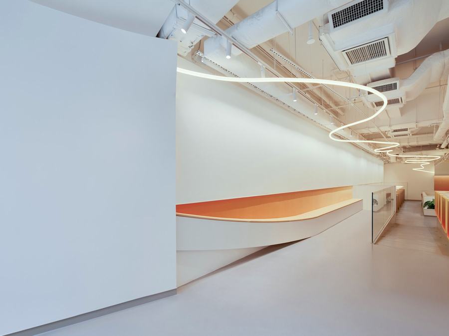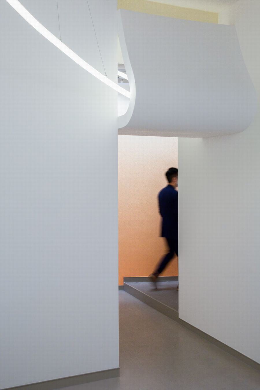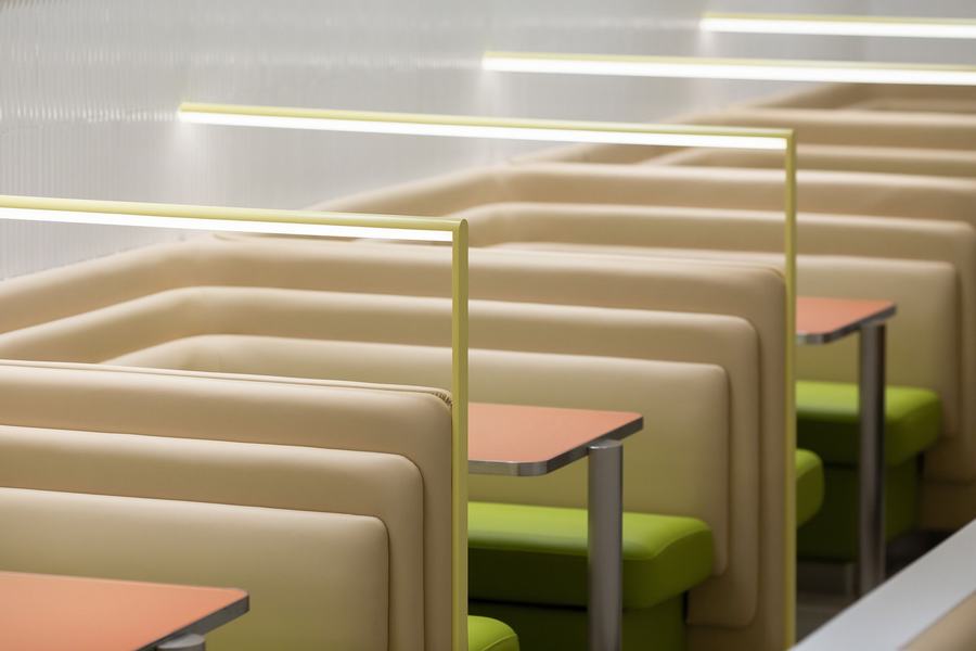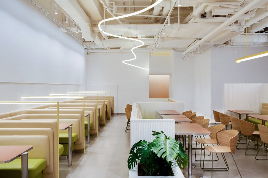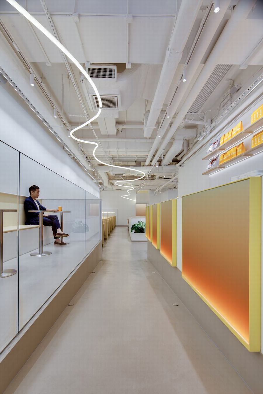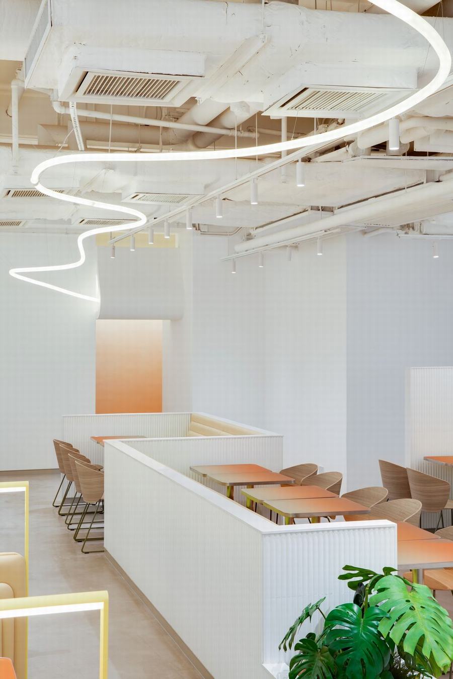 墙壁和天花板被设计成像蛋糕一样剥落或切下,在内部创造几个流动的时刻。在双层高的店面,鸡蛋扮演着从蛋糕到糕点的重要角色,天花板被剥开,露出面包房上方的蛋黄。