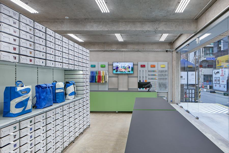 一家使用二手卡车防水布、安全带和自行车内胎制作独一无二的袋子的公司在商店设计上也有独到之处。在这里,原创每次都便宜又快。瑞士出生的三维设计师 Leandro Destefani (zauberaller.art) 从苏黎世的 FREITAG 工厂中汲取灵感。该设计由 Jongil Lee(Yigak Construction)变为现实。这不是这两个好朋友第一次聚在一起为 FREITAG 在韩国的存在做一些不寻常的事情。