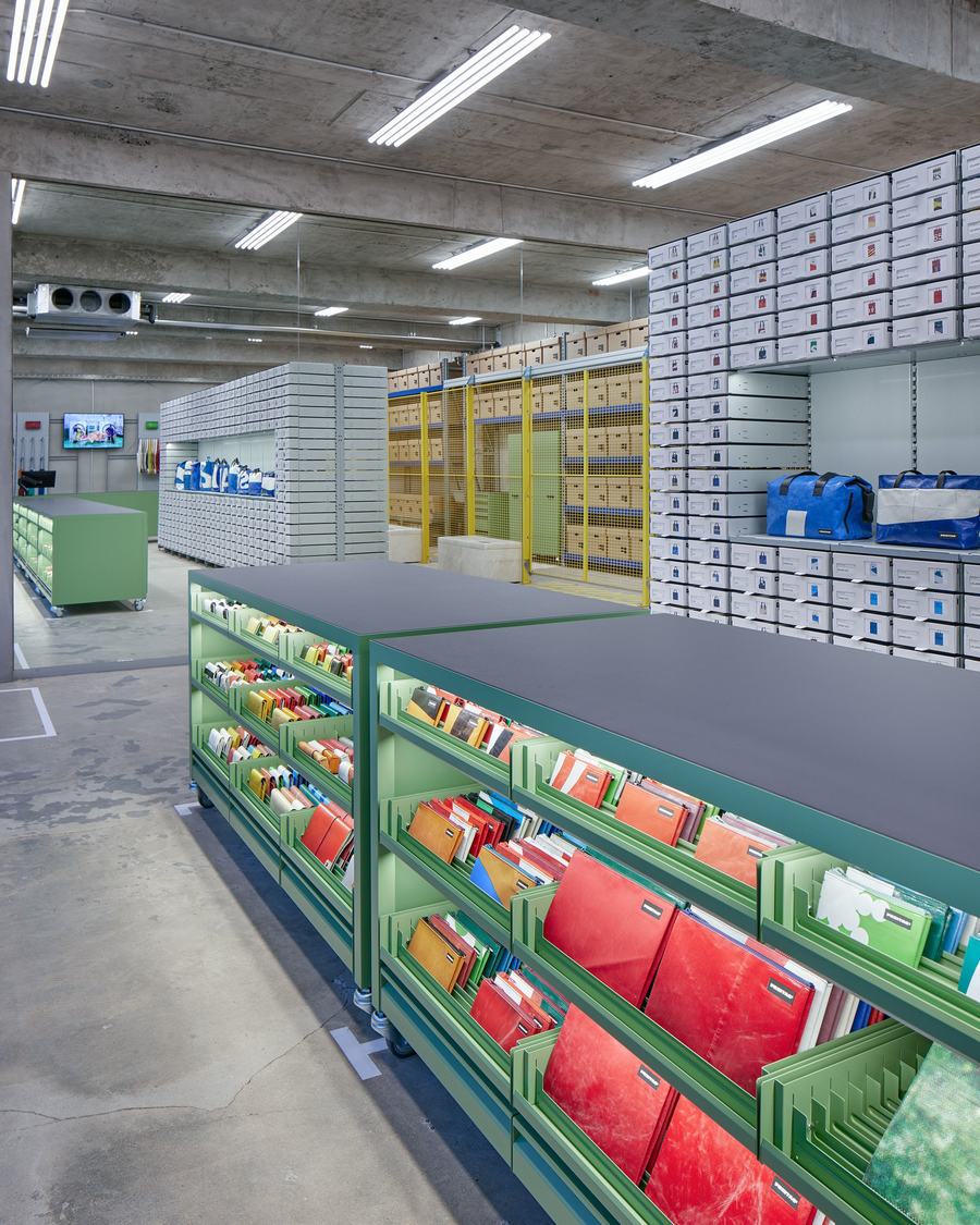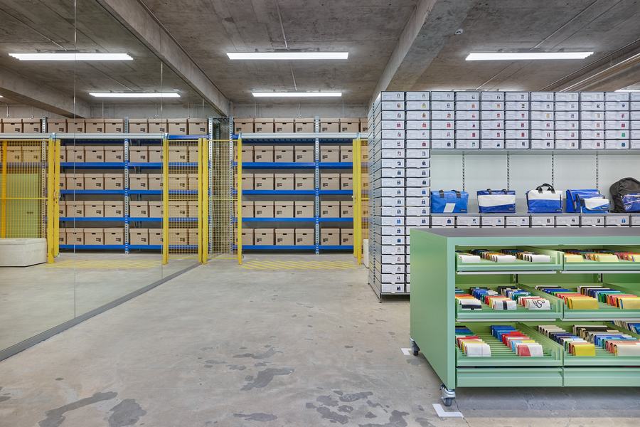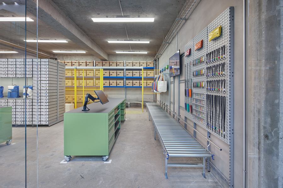 这家新的 FREITAG 商店将没有什么可隐瞒的。任何有兴趣的人都可以清楚地看到被独特的卡车防水布覆盖的产品。产品直接放在商店门口。在内部,也有一种开放和透明的精神。面向客户并散发出明显工业氛围的是一个高架仓库,带有特色的 FREITAG 箱子和从入口到存储区的传送带。这种“仓库在车间”解决方案的明显优势是什么?仓库工作人员可以跟踪货物的流动,并确保补货过程非常顺利。