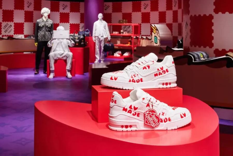 此外,在二楼的活动空间,本季新推出的庞贝红与白的组合,将本系列的代表设计“Giant Damier”装饰在墙壁上。出现在外墙和橱窗上的龙也沿着墙壁放置。