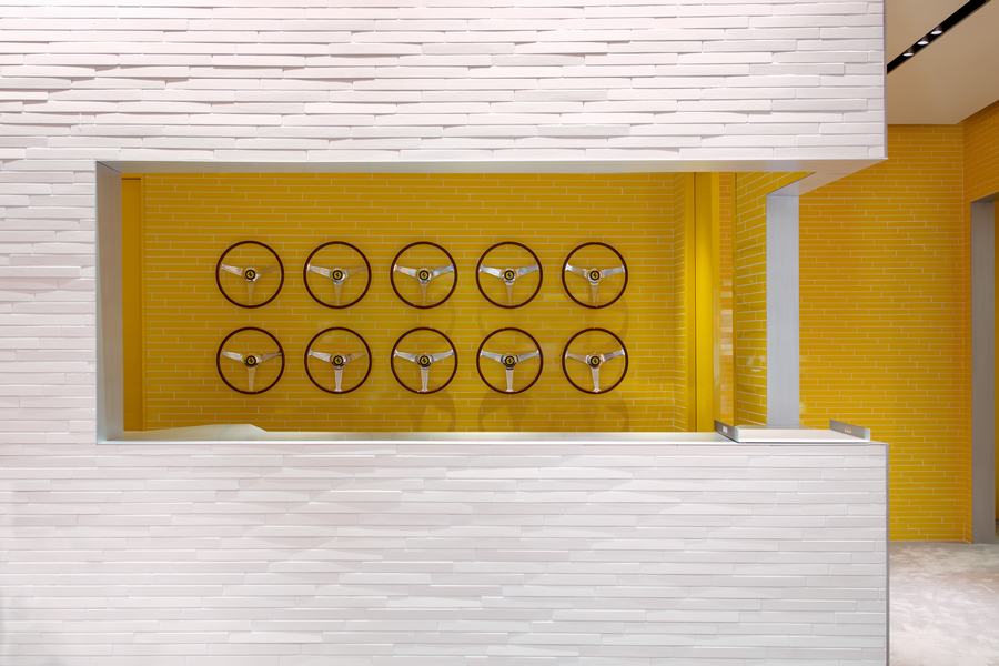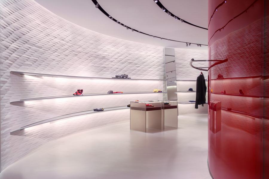 玻璃后面是一堵手工制作的白色砖墙,作为产品的背景;粘土砖代表了法拉利原型车最初的粘土建模过程,然后汽车变成了金属形式。一个弯曲的连续的拉丝金属货架系统从粘土砖的墙壁中出现,并扩展成为一个全深度的货架,运行着整个商店,创造了一个动态的零售展示与货架和栏杆。