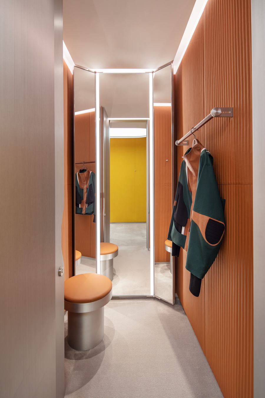 柱廊陶土立面唤起了意大利的古典遗产,通过它可以瞥见诱人的内部场景。为了与外部形成对比,建筑师选择了玻璃,这种材料可以是彩色的,可以在蜿蜒的运动中弯曲和波动。红色的玻璃带穿过商店内部,流畅的线条在传统的法拉利红色中像波浪一样移动,复制了菲奥拉诺赛道的曲线。