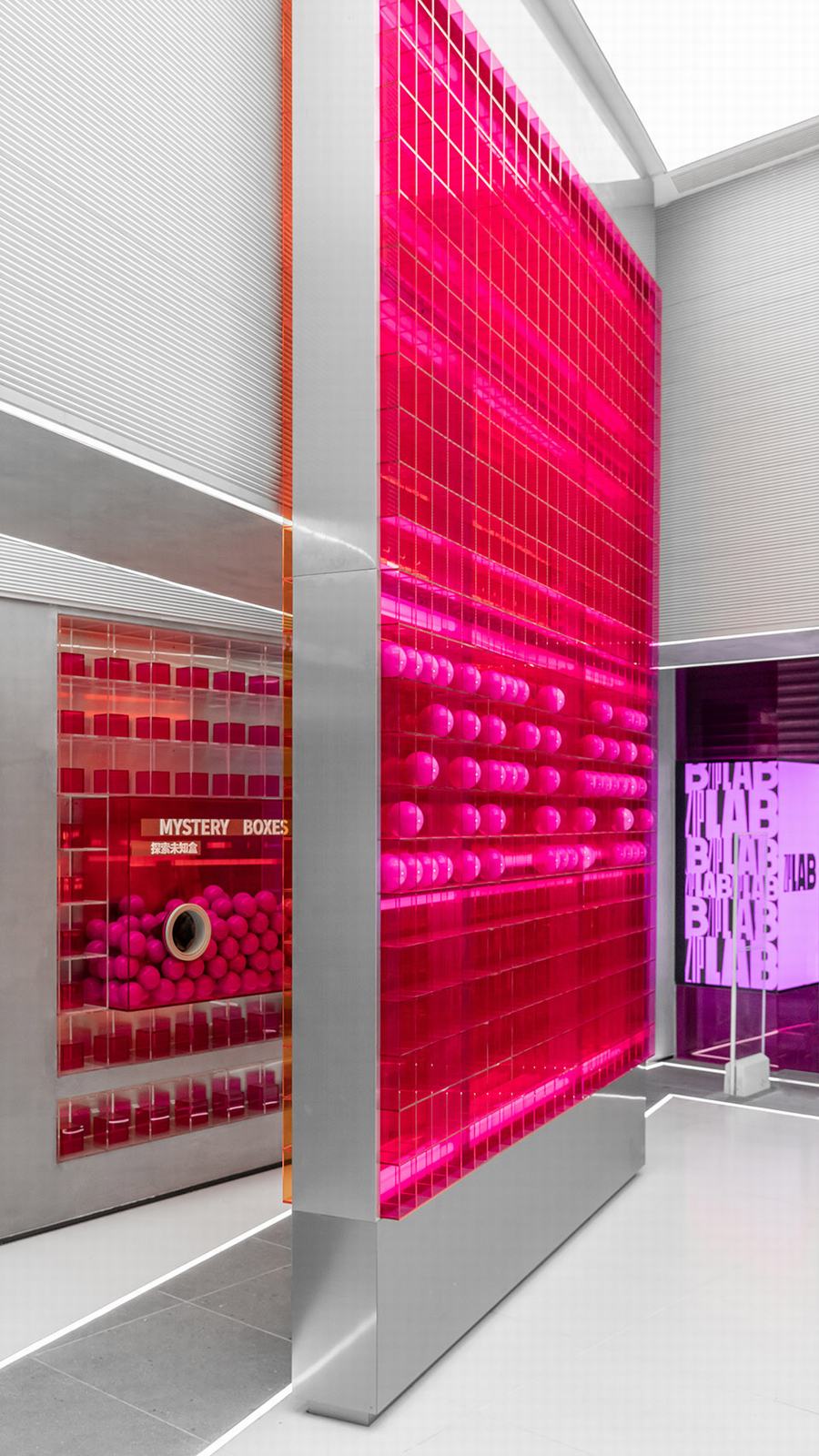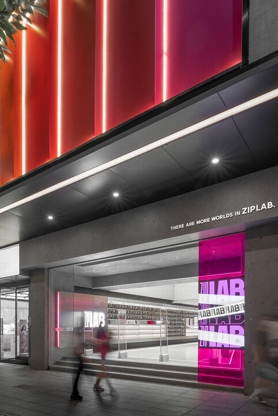ZIPLAB是洋葱全球商业生态圈内的跨境电商线下体验店,致力于为年轻用户打造全新的经济圈。广州北京路店和海口万达店,属于同一系列的风格,旨在探索如何构建人与产品之间的联系,建立人与产品之间的交互,实现人与场景的集合,从而创造更大的流量价值和社会消费,产生更多的经验,通过符号、隐喻和当代语境下的景观建构。